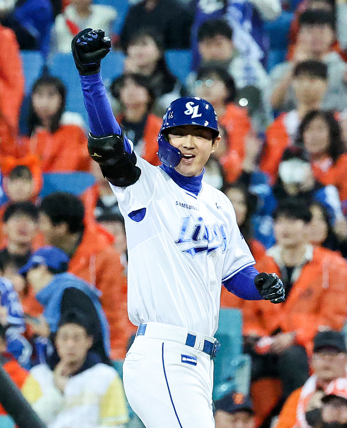 22일 대구 수성구 삼성라이온즈파크에서 열린 2025 신한 SOL 뱅크 KBO 포스트시즌 플레이오프 4차전 한화 이글스와 삼성 라이온즈의 경기, 6회말 무사 주자 1,3루 상황에서 삼성 구자욱이 1타점 적시타를 친 뒤 기뻐하고 있다. 2025.10.22. 대구=뉴시스