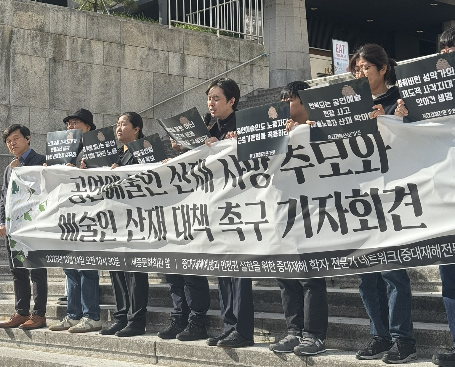 ‘중대재해 예방과 안전권 실현을 위한 학자·전문가 네트워크’가 지난달 24일 서울 종로구 세종문화회관 앞에서 기자회견을 열고 있다. 이들은 “반복되는 예술인의 산업재해를 방지할 대책을 마련해야 한다”고 촉구했다. 중대재해전문가넷 제공