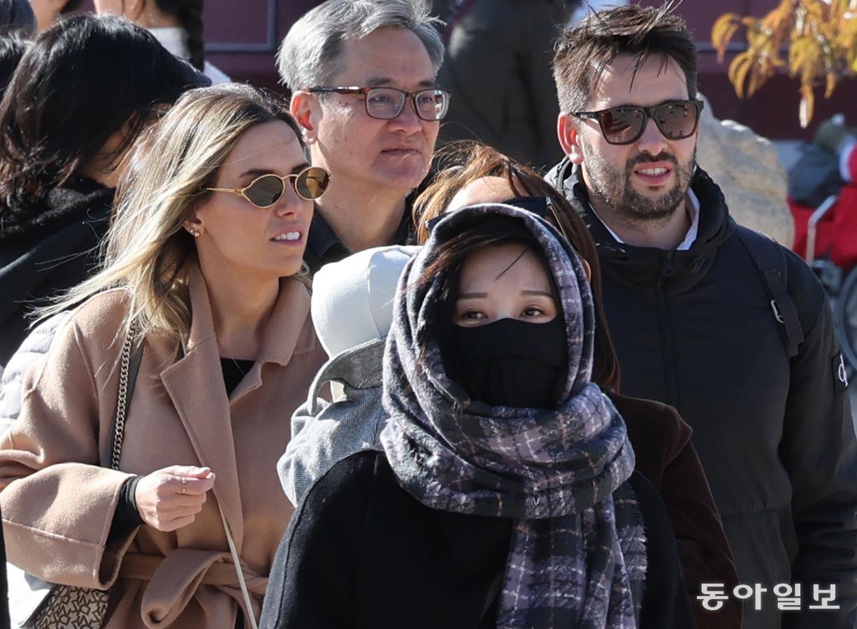오후 들어 추워진 2일 서울 종로구 경복궁에서 목도리, 마스크로 무장한 관광객이 관람을 하고 있다. 기상청은 3일 일부 지역 기온이 영하로 내려가고 낮과 밤의 기온차가 15도 안팎으로 클 것으로 예보했다. 홍진환 기자 jean@donga.com