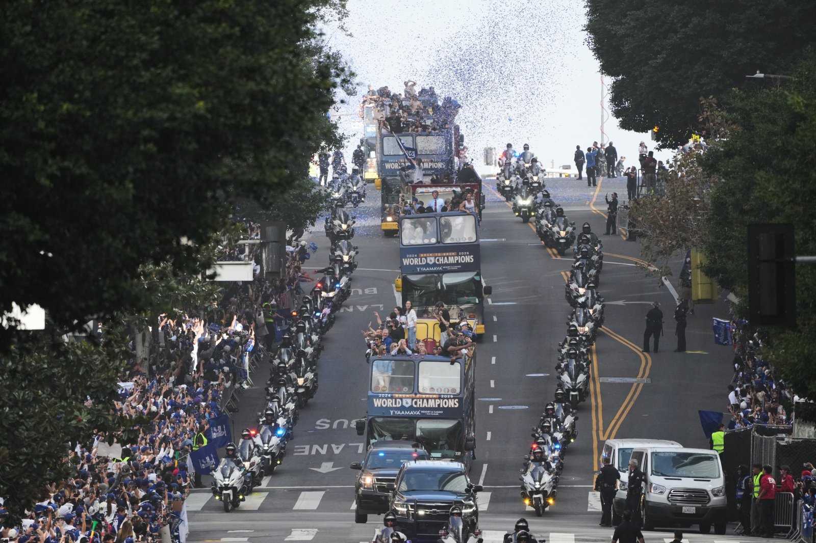 2층 버스에 오른 다저스 선수단과 코칭스태프, 구단 프런트는 템플 스트리트와 브로드웨이 교차로에서 출발해 도심을 가로질렀다. 이날 퍼레이드에는 다저스 구단주 매직 존슨도 함께했다.