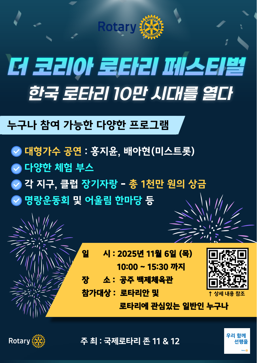 행사는 아레조 회장과 장애인 단체, 지구별 깃발과 배너가 입장하는 퍼레이드로 시작된다. 이어 △명랑운동회 △O·X 퀴즈 △장기자랑 △로타리 감동 이야기 발표 등 다채로운 프로그램이 진행된다. 오후에는 가수 홍지윤, 선율, 배아현, 라클라쎄 등이 출연하는 ‘나눔 콘서트’가 열려 축제 분위기를 한층 뜨겁게 달굴 예정이다.