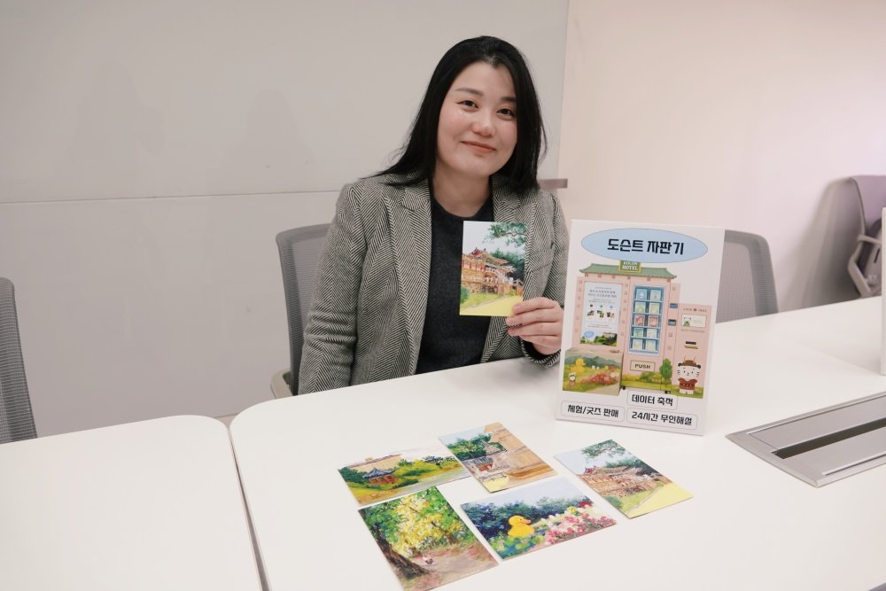 자판기씨는 올해 6월 경북 경주에 위치한 코오롱 호텔 로비에 첫 선을 보였다. 경주나 코오롱 호텔 곳곳의 풍경과 관련 해설이 담긴 QR 코드를 엽서에 담아 감각적으로 제공했다. QR 코드의 해설에 따라 해당 공간을 더욱 잘 즐길 수 있도록 만들었다. 또 ▲자개 썬캐처 만들기 ▲전통 보석 족두리 만들기 ▲솔방울 팔찌 만들기 등 체험 키트도 판매하며 가족 단위 고객까지 사로잡았다. 바쁜 호텔 라운지에서 컨시어지 역할을 톡톡히 하고 있는 셈이다. 이에 경주 코오롱 호텔은 자판기씨의 내년 연장 계약도 확정지었다.