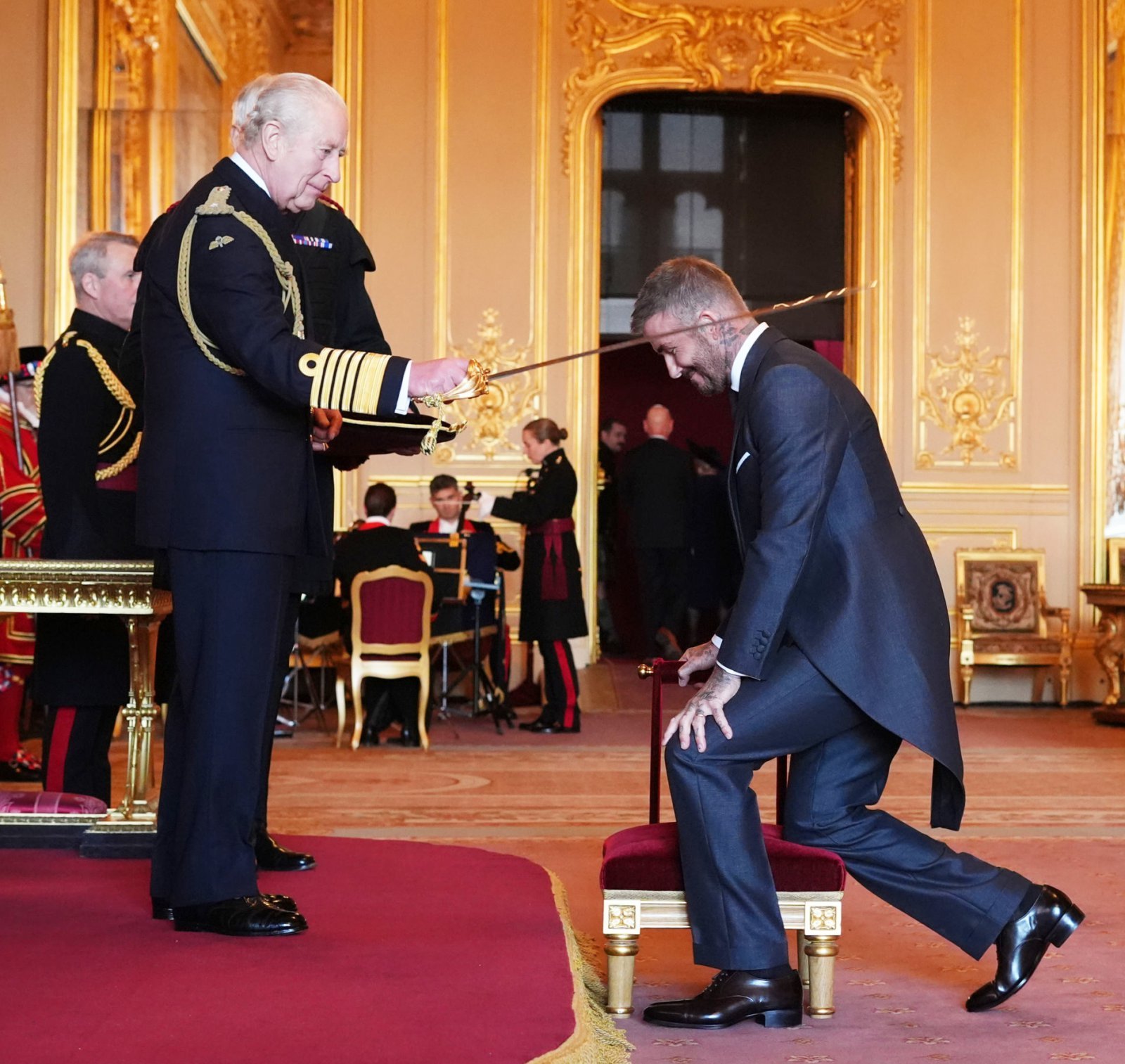 데이비드 베컴(오른쪽)이 4일(현지 시간) 영국 버크셔 윈저성에서 찰스 3세 국왕으로부터 기사 작위를 받고 있다. 윈저=AP/뉴시스