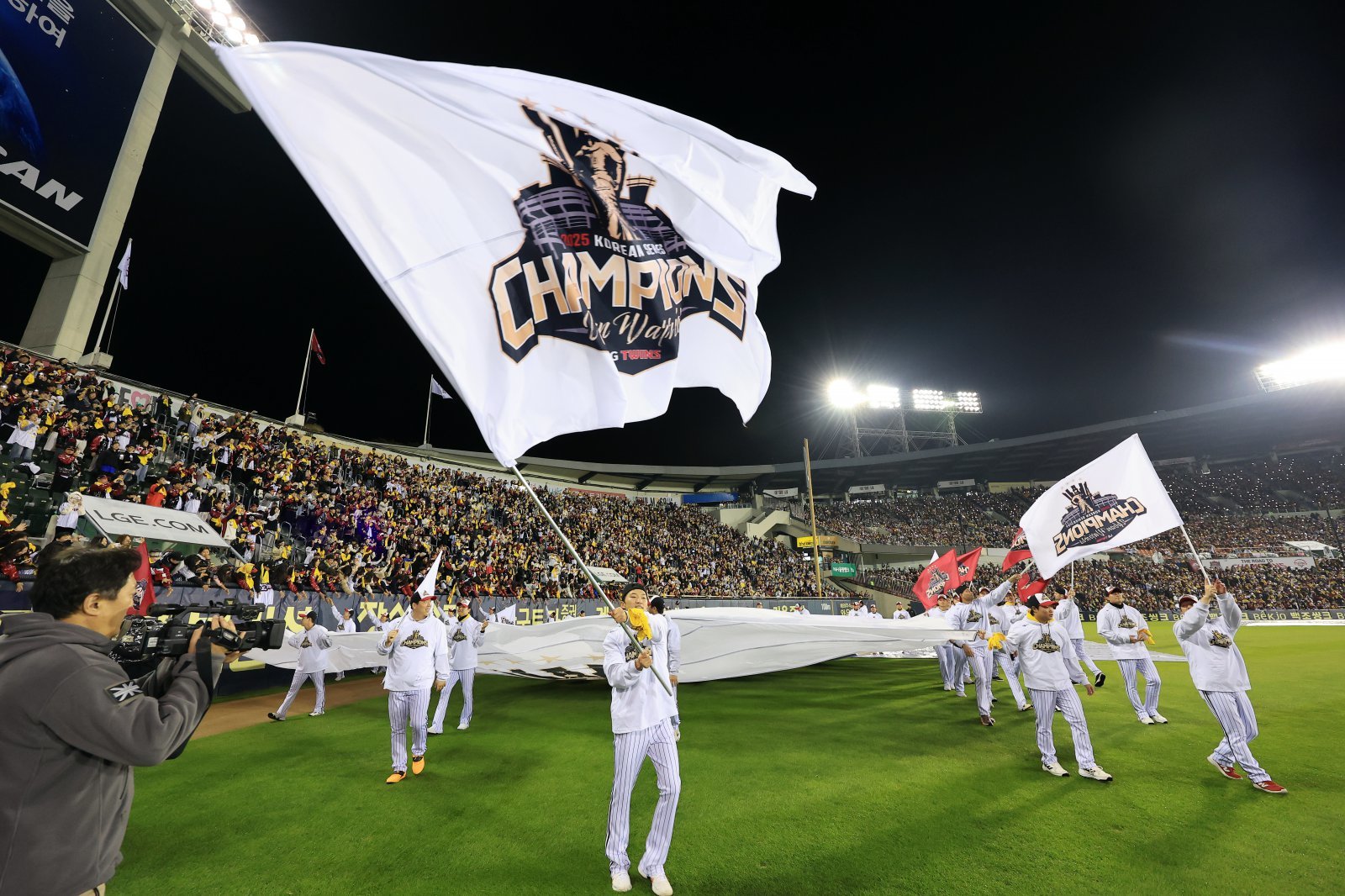 1일 서울 송파구 잠실야구장에서 열린 프로야구 LG트윈스의 2025 한국시리즈 우승 세리머니 팬 감사 행사 ‘더 리턴 오브 챔피언스’(The Return of Champions)‘에서 선수단이 그라운드 행진을 하고 있다. LG트윈스는 지난달 31일 2025 신한 SOL뱅크 KBO 한국시리즈(KS·7전 4선승제) 5차전에서 한화 이글스를 4-1로 꺾고 시리즈 전적 4승1패로 우승을 차지하며 2년 만에 통합 우승을 달성했다. 2025.11.1/뉴스1 ⓒ News1