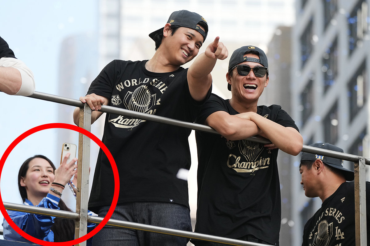 LA다저스의 간판 스타 오타니 쇼헤이가 3일(현지 시간) 메이저리그 우승 기념 퍼레이드에 참석해 기뻐하고 있다. 그의 왼쪽에서 구형 아이폰으로 사진을 찍고 있는 여성이 그의 아내 다나카 마미코다. AP=뉴시스