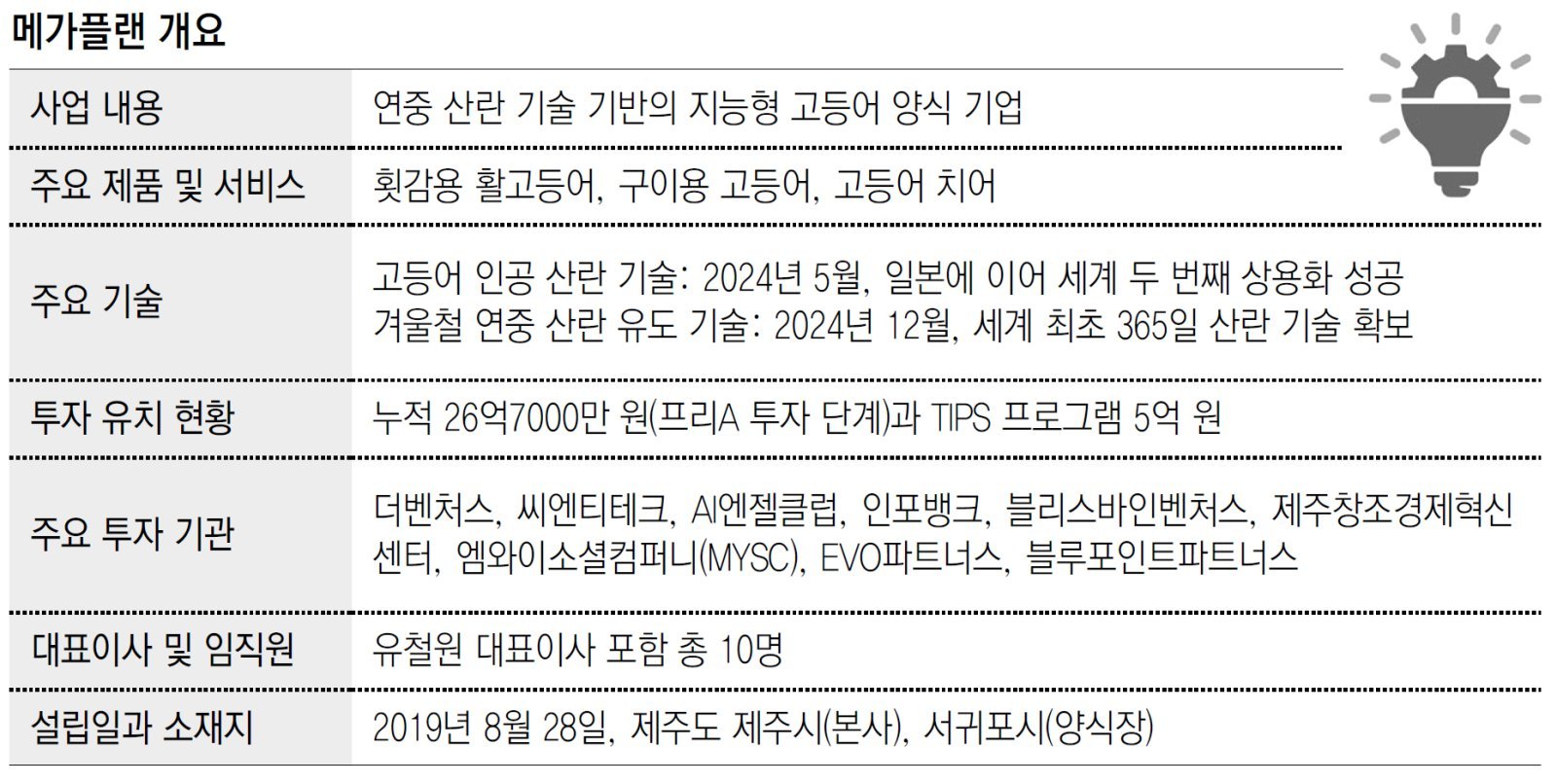 제주시에 본사를 둔 스타트업 메가플랜은 세계적으로 사라져 가는 어종인 고등어의 대량 생산 기술을 개발한 스타트업이다. 지난달 29일 서귀포시 표선면 제주 민속촌 인근에 있는 메가플랜 양식장에서 유철원 대표이사(49)를 만났다. 메가플랜은 세계에서 처음으로 고등어 연중 산란 기술을 개발했다. 표선 양식장에서는 현재 20만 마리의 고등어를, 가두리가 아닌 육상 양식 방법으로 기르고 있다. 유 대표는 “산란 시기를 조절해 출하 시기까지 조절할 수 있는 기술은 우리가 세계에서 처음 개발했다”고 했다. 연중 산란은 아니지만 인공 산란 기술로 상업화에 먼저 성공한 곳은 일본이다. 국내에서는 2008∼2009년 경남 수산자원연구소 등이 인공 산란과 치어 양식 등에 성공했지만 양식장으로 옮겨 성어까지 키우는 상업화에는 성공하지 못했다. ● 삼성중공업에서 쌓은 경험이 도움