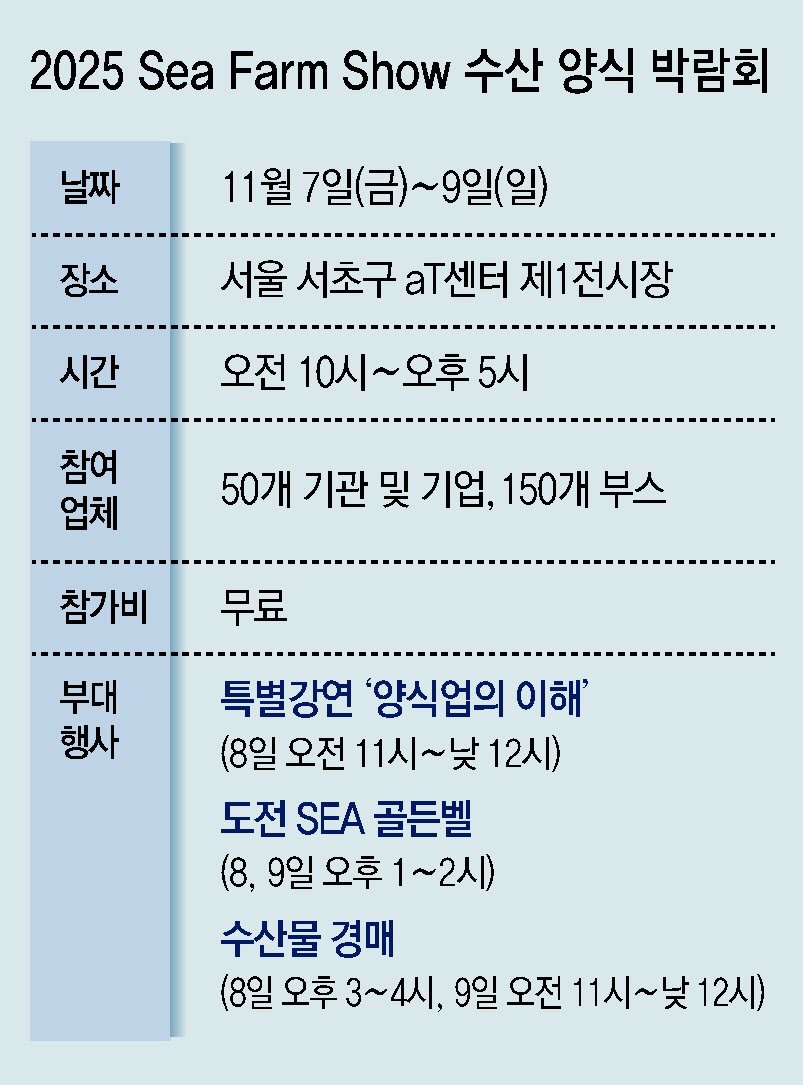 국내 최대 규모의 해양 수산양식 박람회인 ‘2025 Sea Farm Show’가 7일 서울 서초구 aT센터에서 개막했다. 동아일보와 채널A, 해양수산부가 공동으로 주최하는 박람회는 ‘AI와 첨단기술로 여는 스마트 수산양식의 미래’라는 주제로 9일까지 열린다. 지방자치단체와 공공기관, 기업 등은 총 150개 부스를 마련하고 인공지능(AI)을 활용한 스마트 양식 기술을 선보였다. 특히 국내 수산물을 활용한 요리를 소개하고, 체험 행사를 진행하며 방문객들의 만족도를 높였다.