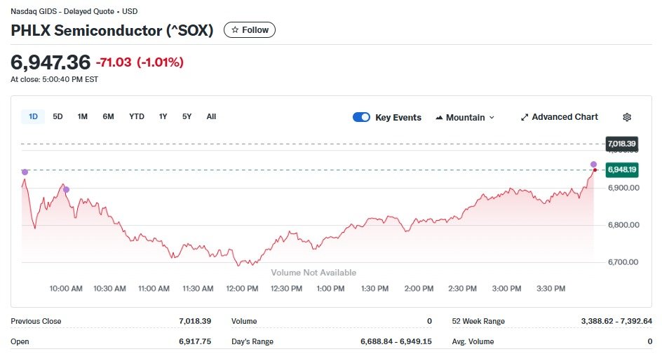 7일(현지 시각) 뉴욕증시에서 반도체지수는 1.01% 하락한 6974.36포인트를 기록했다.