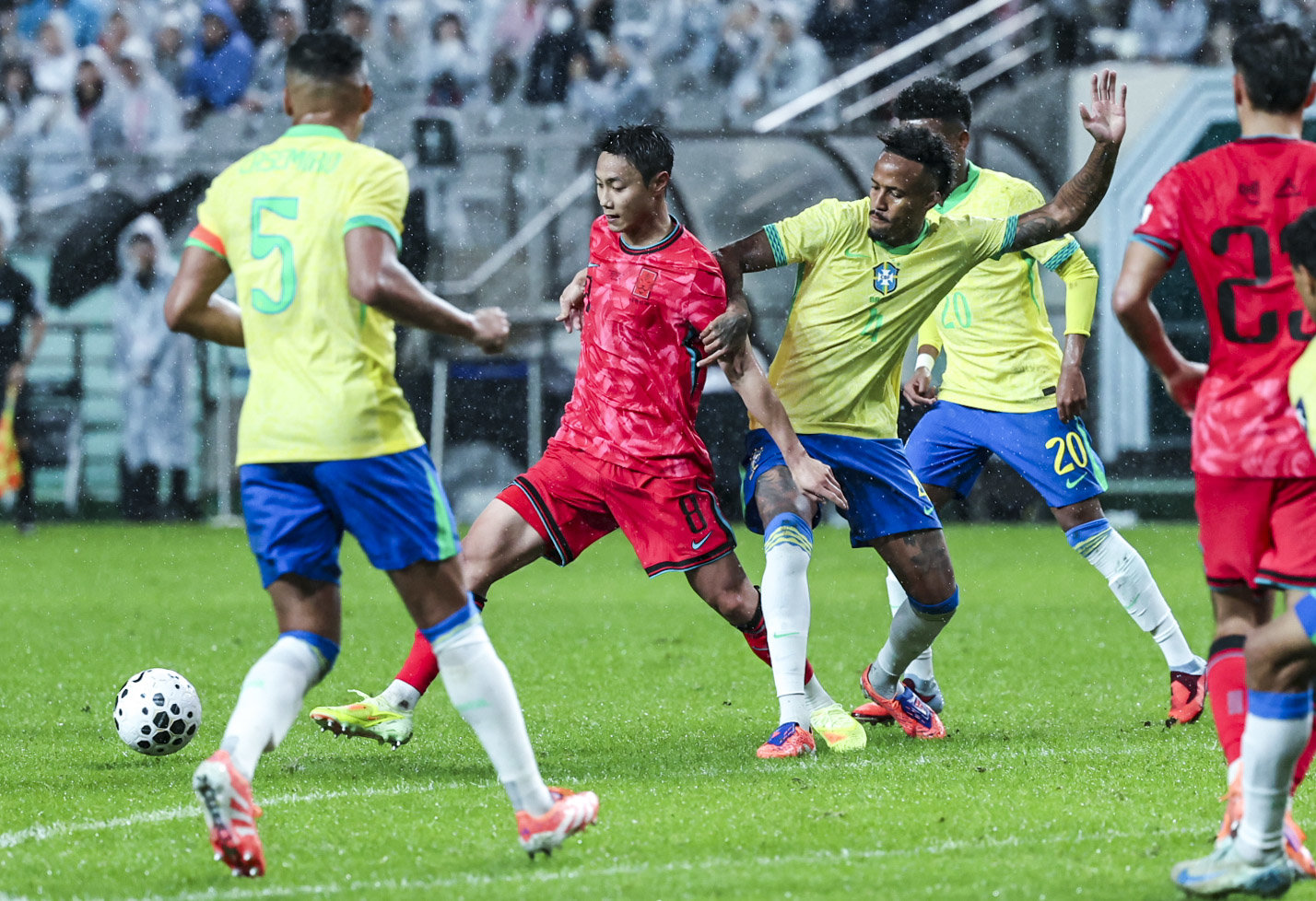 10일 서울 마포구 서울월드컵경기장에서 열린 남자 축구 국가대표 10월 A매치 친선전 대한민국과 브라질의 경기, 백승호가 밀리탕과 몸싸움을 하고 있다. 2025.10.10 [서울=뉴시스]
