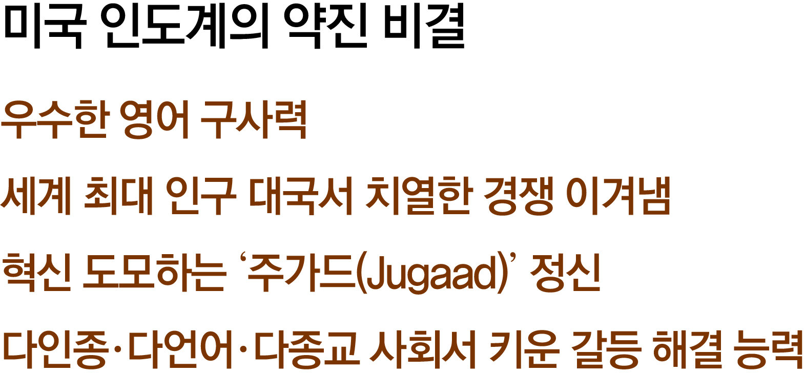 인도계의 약진 이유로 뜨거운 교육열, 우수한 영어 구사 능력 등이 꼽힌다. 지난해 퓨리서치센터 자료에 따르면 25세 이상 인도계 미국인의 77%가 학사 이상 학위를 보유하고 있다. 이 중 학사 학위 소지자는 31%, 석박사 등 고급 학위 소지자는 45%에 달한다. 이는 아시아계 전체(56%)는 물론이고 미국 태생 미국인(31.6%)보다 2배 이상 높은 수치다.