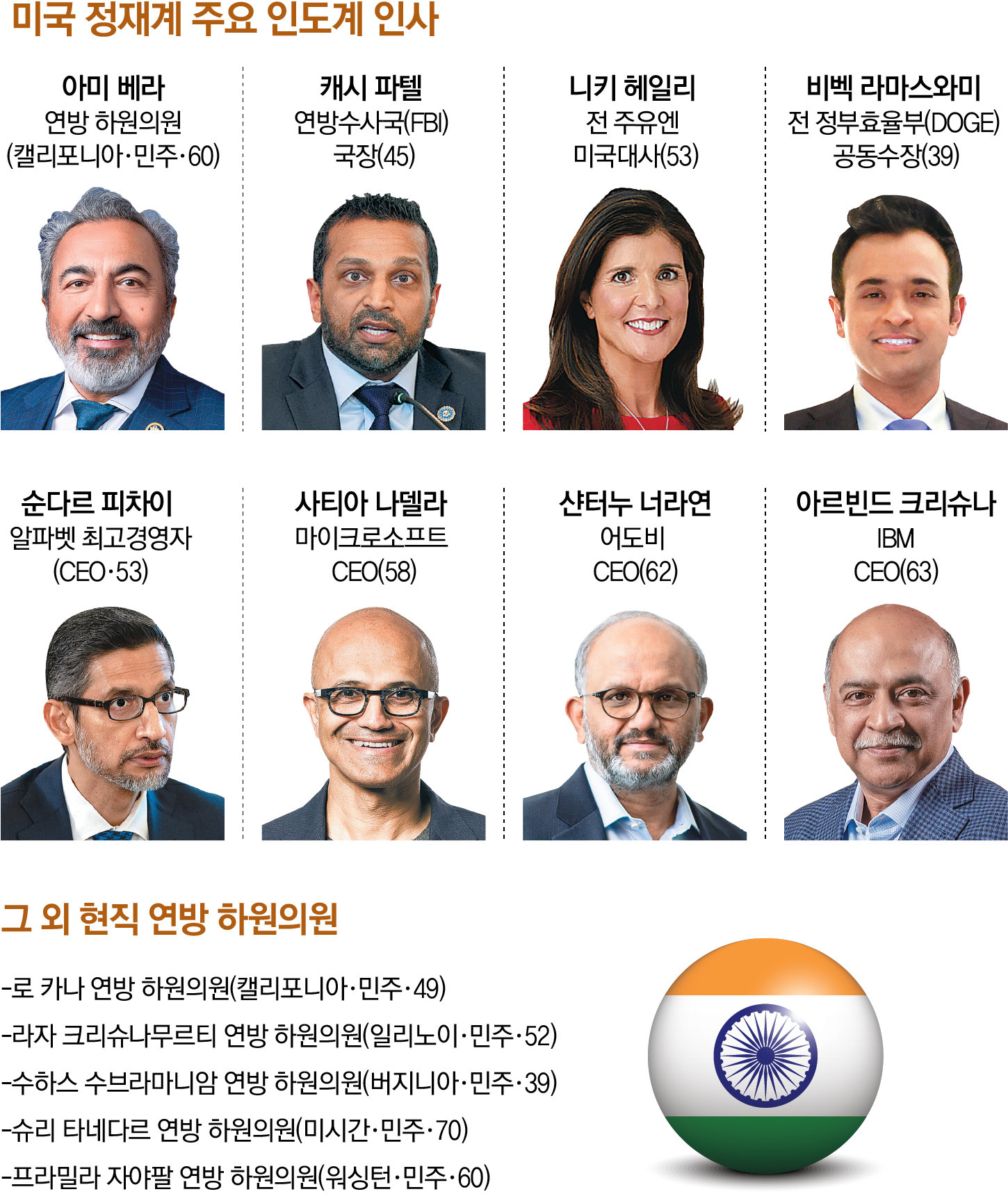 올해 1월 출범한 트럼프 2기 행정부에서도 인도계 인사의 활약이 두드러진다. 트럼프 대통령의 최측근으로 꼽히는 캐시 파텔 연방수사국(FBI) 국장(45)은 국가안보, 방첩 등을 담당하는 공룡 조직 FBI를 이끄는 최초의 인도계 겸 비백인계 수장이다. 인도계 이민자 2세로 자신의 힌두교 신앙을 강조한다. 털시 개버드 국가정보국(DNI) 국장(44) 또한 DNI의 첫 힌두교도 수장이다. 어머니가 힌두교도이며 그 또한 모친의 종교를 물려받았다.