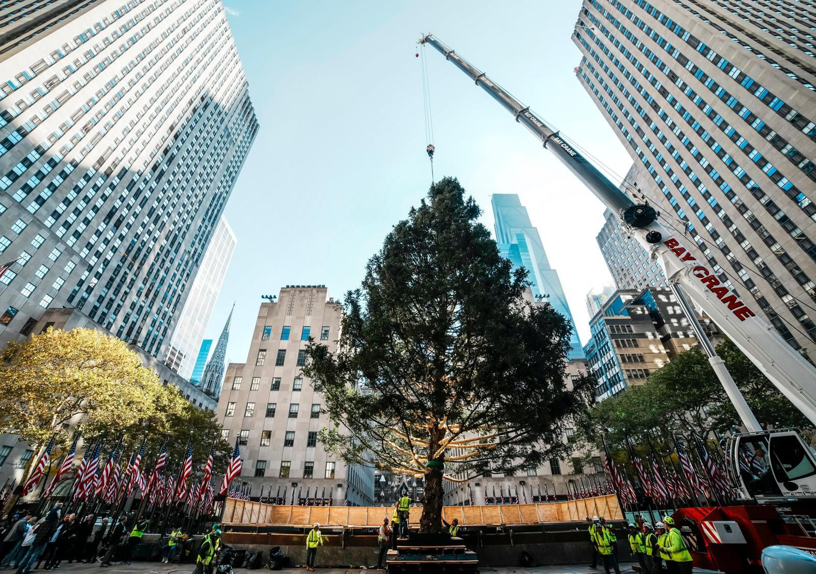 8일 미국 뉴욕 록펠러센터 앞에 약 23m 높이의 크리스마스트리가 설치되고 있다. 매년 설치되는 화려한 장식의 이 트리는 뉴욕의 명물로 꼽힌다. 올해 트리 점등식은 다음 달 3일에 열린다.