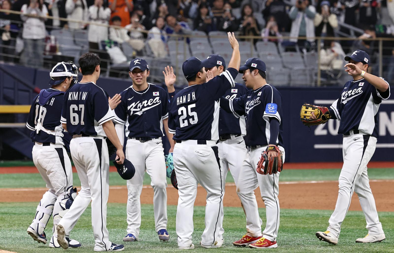 한국 야구 국가대표팀 선수들이 9일 체코와의 평가전을 11-1 대승으로 장식한 뒤 하이파이브를 하고 있다. 뉴스1