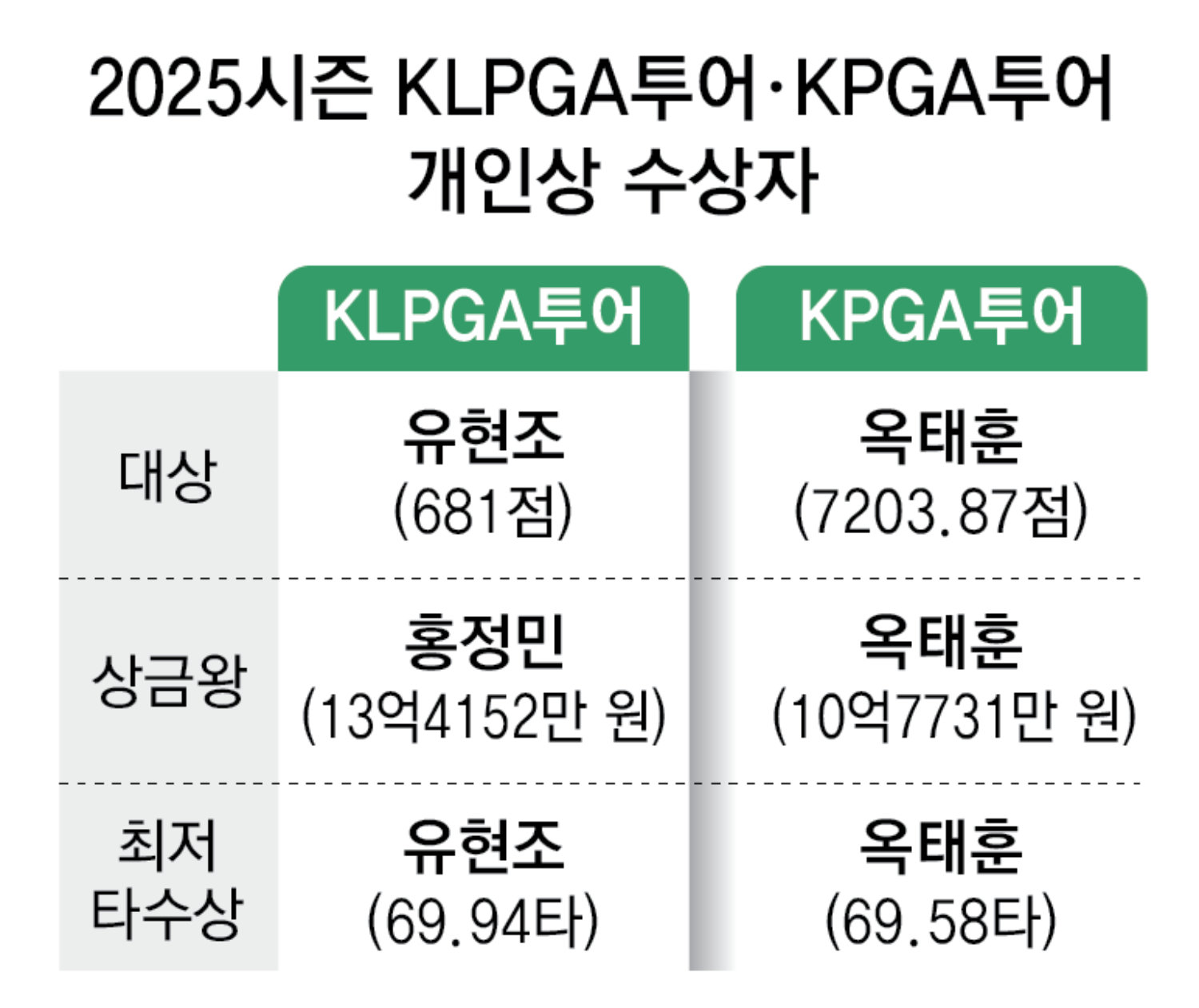옥태훈(27)은 대상과 상금왕, 다승왕, 최저타수상 등 4관왕에 오르며 ‘옥태훈 시대’를 알렸다. 사돔 깨우깐자나(27·태국)는 외국인 선수 최초로 KPGA투어 신인왕이 됐다.