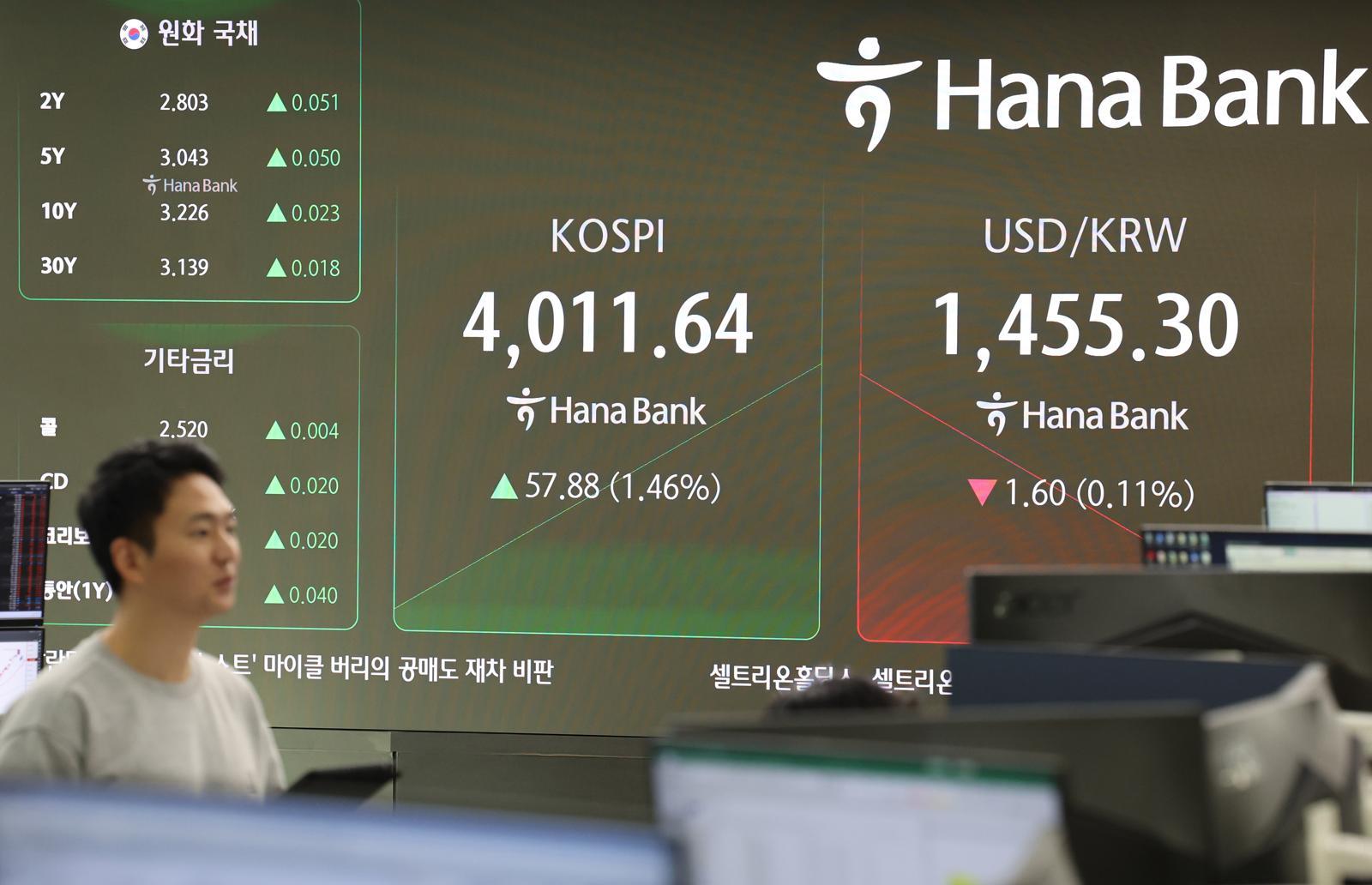 10일 오전 서울 중구 하나은행 딜링룸 전광판에 코스피가 전 거래일보다 57.88 포인트(1.46%) 오른 4011.64 포인트를 나타내며 상승 출발하고 있다. 원달러 환율은 1.60원(0.11%) 내린 1455.30원. 2025.11.10. [서울=뉴시스]