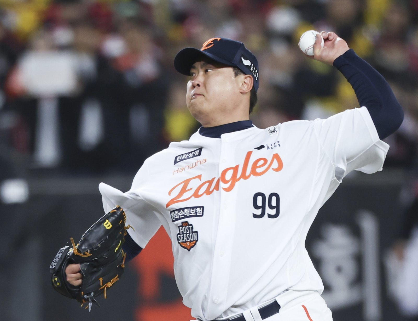 31일 대전 중구 한화생명볼파크에서 열린 2025 KBO 한국시리즈 5차전 LG 트윈스와 한화 이글스의 경기, 8회초 한화 구원투수 류현진이 공을 던지고 있다. 2025.10.31. [대전=뉴시스]