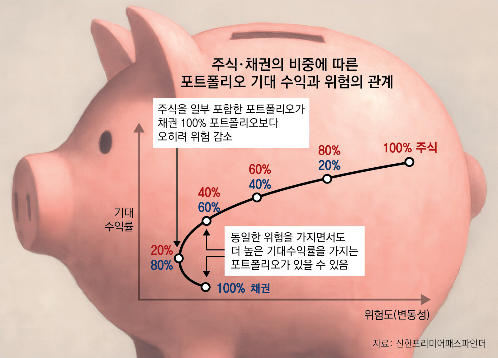 연금 자산의 기대수익률을 높이고자 한다면 자산의 일부를 주식시장에 투자해야 한다. 100% 채권 투자보다는 주식 20%, 채권 80%의 포트폴리오가 위험은 적고 기대수익률이 높다.