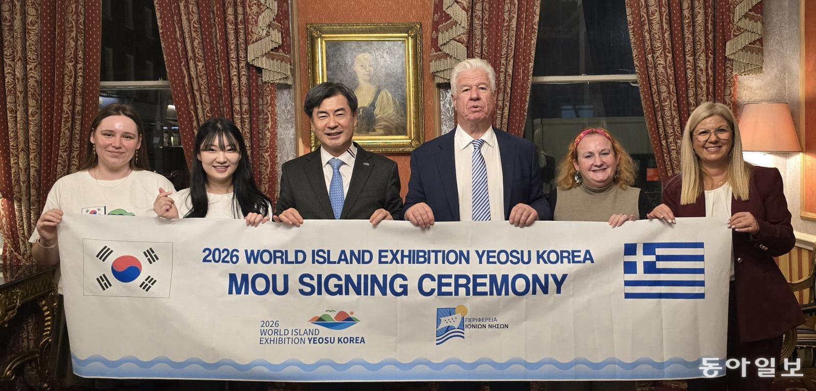 5일(현지시간) 영국 런던에서 2026여수세계섬박람회 조직위원회가 그리스 이오니아주와 참가협약(MOU)을 체결하고 기념촬영을 하고 있다. 이번 협약으로 프랑스, 에스토니아, 마다가스카르, 페루, 케냐 등 18개국과 아시아태평양환경보건센터 등 총 19곳이 섬박람회 참가를 확정했다. 2026여수세계섬박람회 조직위원회 제공