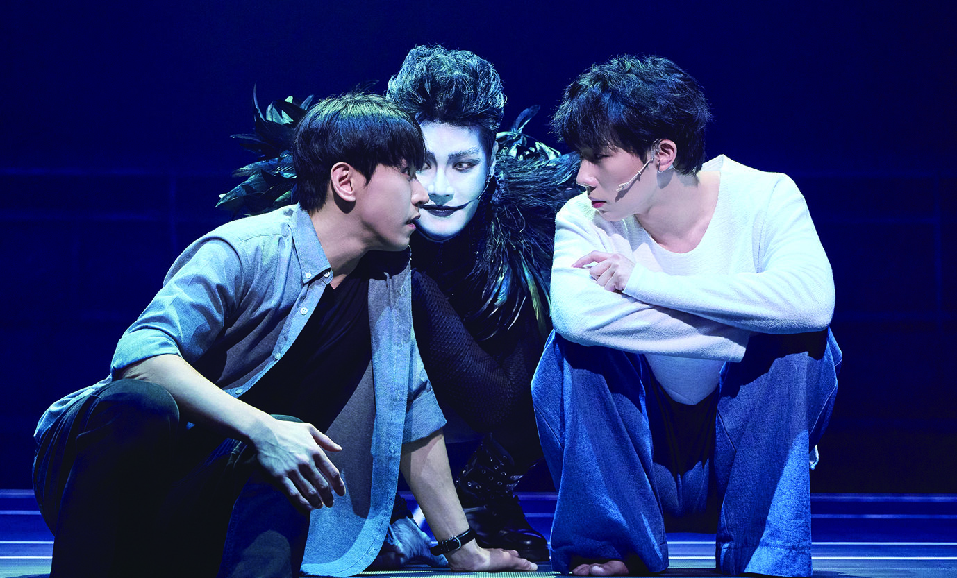 뮤지컬 ‘데스노트’에서 테니스 경기 후 라이토(조형균·왼쪽)와 엘(김성규·오른쪽)을 사신 류크(임정모·가운데)가 지켜보고 있다.