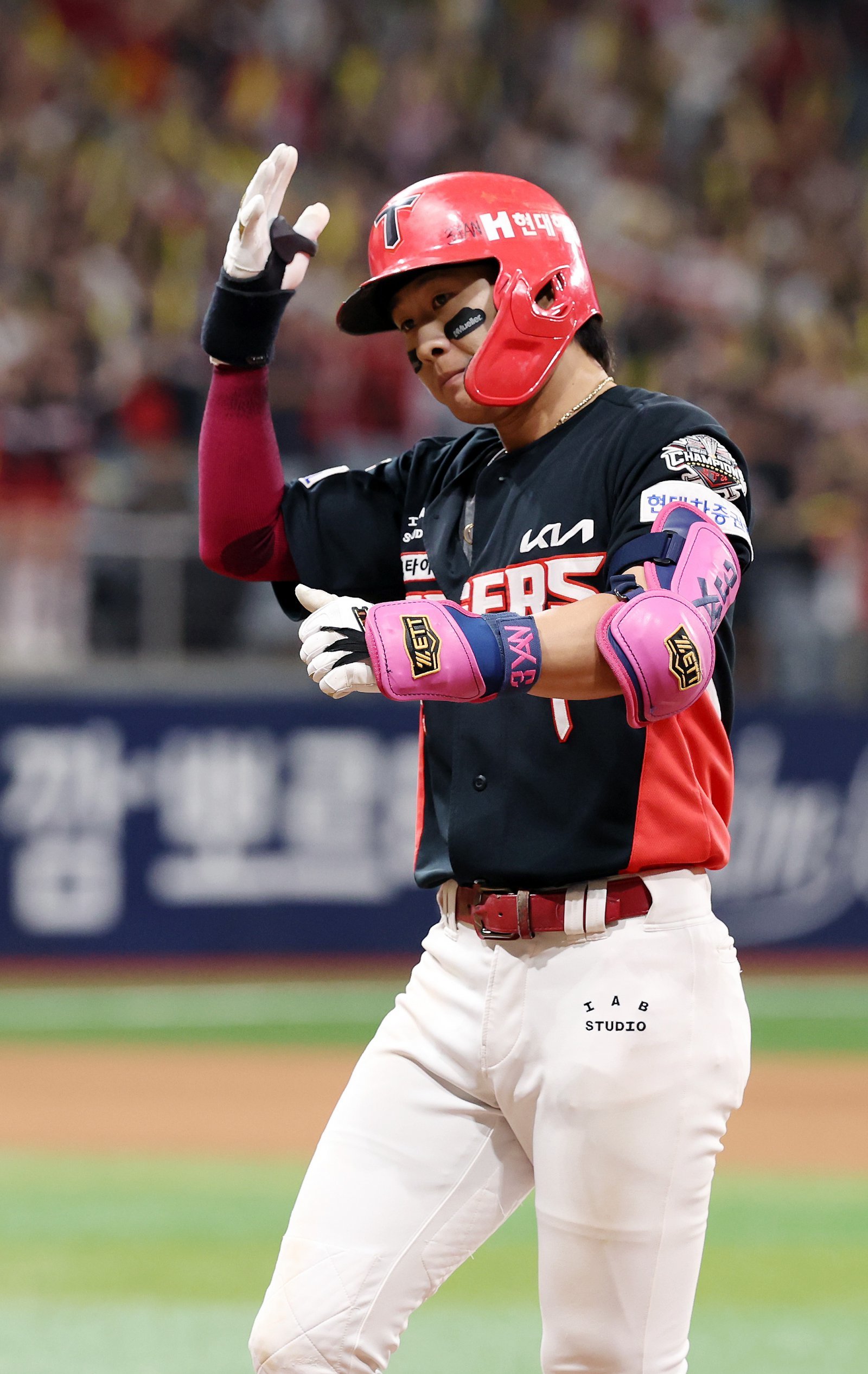 25일 오후 서울 구로구 고척스카이돔에서 열린 프로야구 ‘2025 신한 SOL뱅크 KBO 리그’ KIA와 키움의 경기, 9회초 무사 만루 찬스 때 KIA 박찬호가 1타점 적시타를 때려낸 뒤 기뻐하고 있다. 2025.6.25 뉴스1