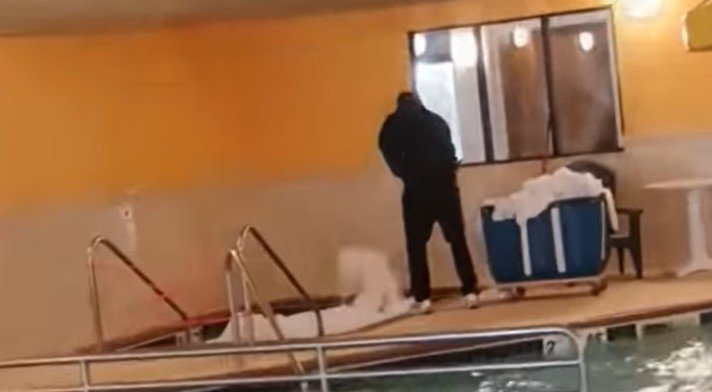 호텔 투숙객들은 사우나를 이용하던 중 한 직원이 염소 처리된 물에 시트를 넣고 빗자루로 휘젓는 모습을 목격하고 이를 촬영했다.