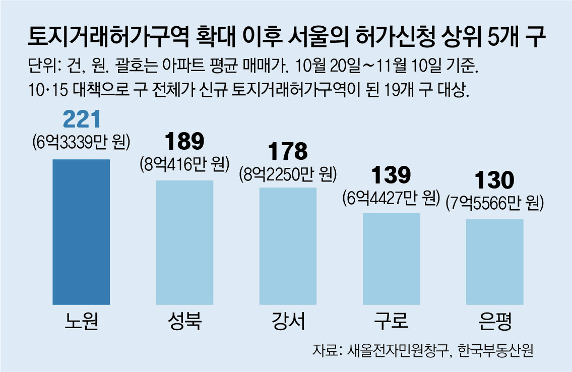 12일 동아일보가 지난달 20일부터 이달 10일까지 22일간 강남, 서초, 송파, 용산구 등 기존 토허구역을 제외한 신규 토허구역 19개 자치구의 토지거래허가신청 건수를 종합한 결과 노원구가 221건으로 가장 많았다. 이어 성북구(189건), 강서구(178건), 양천구(173건), 구로구(139건) 순이었다. 상위 3개 구 신청 건수는 서울 25개 전역 토지거래허가 신청 건수(2527건) 중 23.3%를 차지했다.