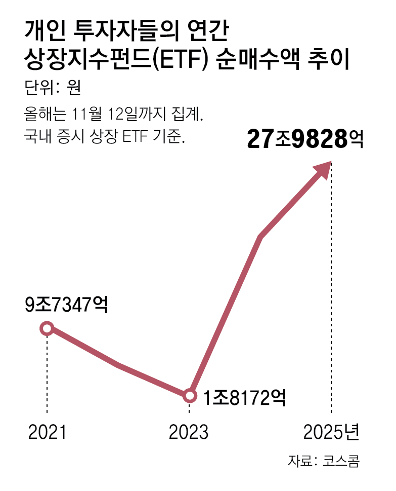 12일 금융 정보기술(IT) 인프라 기업 코스콤에 따르면 개인들은 올해 들어 국내 시장에 상장된 ETF를 총 27조9828억 원어치 순매수했다. 아직 올해가 한 달 반가량 남았음에도 이 수치는 지난해 개인의 연간 순매수 규모(19조7551억 원)를 8조 원 이상 웃돈다. 이는 코스콤이 해당 통계를 집계한 2014년 이후 가장 큰 규모다.