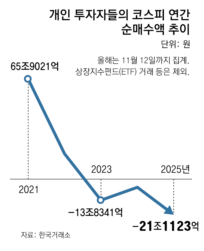 ‘개미’ 투자자들은 올해 코스피 시장에서 ‘팔자’ 행렬을 이어가 시장의 의문을 샀다. 코스피가 가파르게 오르는 와중에도 개인 투자자들은 5∼10월 6개월 연속 순매도에 나선 것이다. 한국거래소에 따르면 개인 투자자들의 올해 1∼11월 코스피 시장 순매도액은 21조1123억 원(ETF는 제외)에 이른다. 이러한 순매도 행렬은 개미 투자자들이 개별 주식보다는 상장지수펀드(ETF)를 선호하는 현상이 강화됐기 때문이란 해석이 나온다.