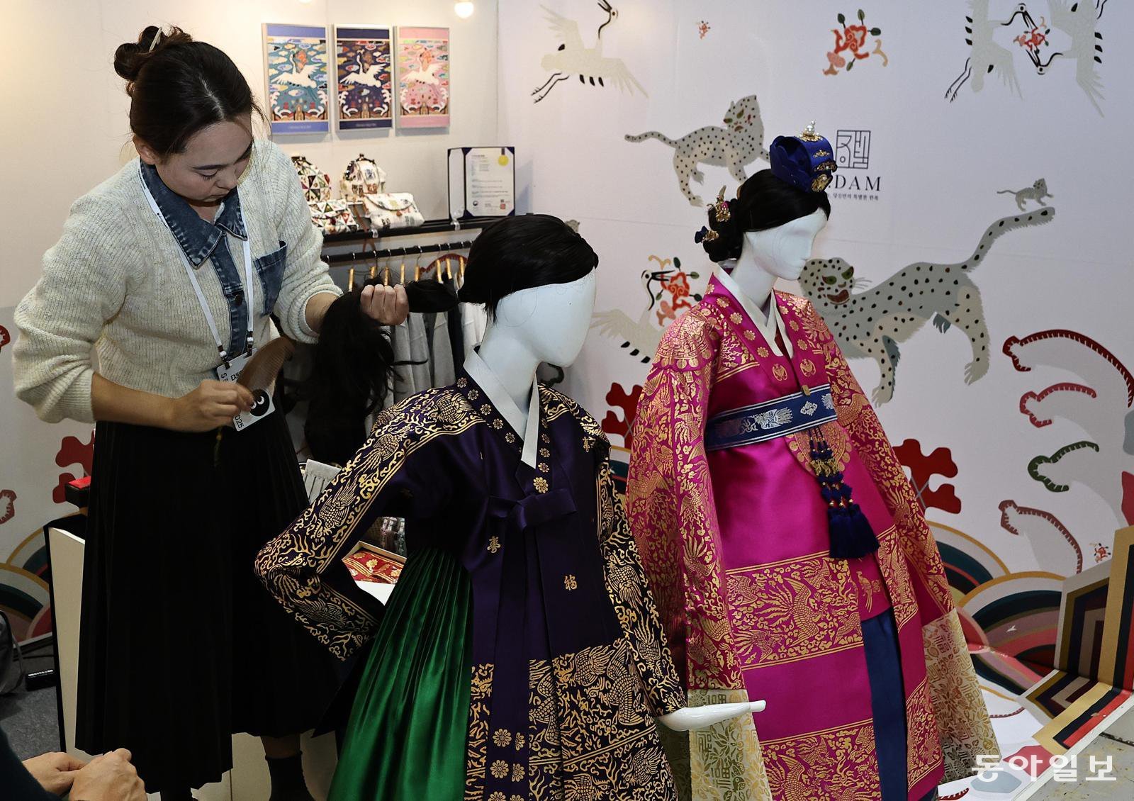 12일 서울 강남구 코엑스에서 열린 디자인 문화 콘텐츠 전시 ‘2025 서울디자인페스티벌’에서 한복 디자인 업체 관계자가 마네킹을 꾸미고 있다. ‘길찾기’라는 주제로 열린 이번 행사는 16일까지 열린다.