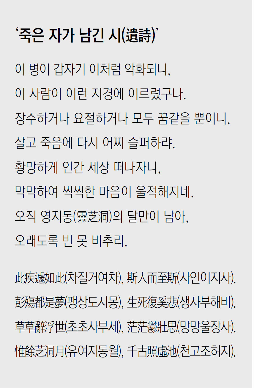 시인은 공자가 아끼던 제자 백우가 죽어가자 “이런 사람에게 이런 병이 있다니(斯人也, 而有斯疾也)”라고 애통해한 말을 가져와 자신의 죽음을 표현했다(논어 ‘雍也’). 하지만 죽음 앞에 절망하지 않고 담담히 자신의 죽음을 조명했다.