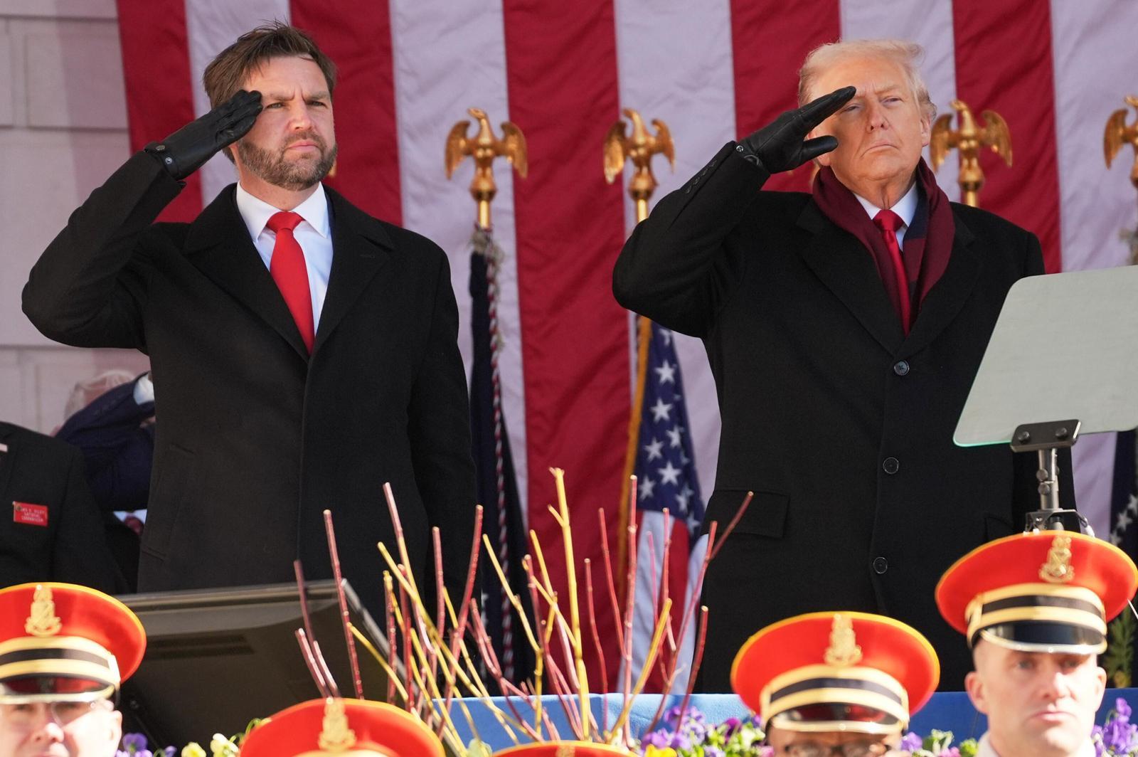 도널드 트럼프 미국 대통령(윗줄 오른쪽)과 J D 밴스 부통령이 11일 버지니아주 알링턴 국립묘지에서 열린 ‘재향군인의 날’ 행사에서 거수경례를 하고 있다. 트럼프 대통령은 이날 ‘재향군인의 날’을 “제1차 세계대전 전승절로 부를 것”이라며 “앞으로 승리를 위해서만 전쟁을 치르겠다”고 강조했다.