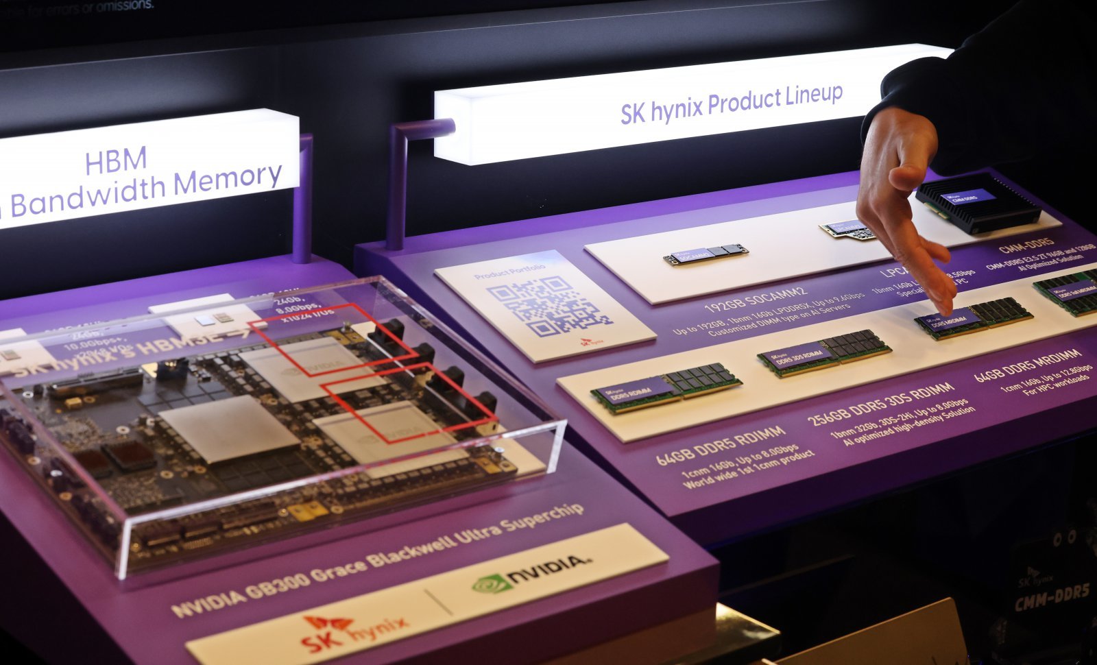 3일 서울 강남구 코엑스에서 열린 ‘SK AI서밋 2025’에서 관람객들이 SK하이닉스 제품 라인업을 살펴보고 있다. 2025.11.3/뉴스1