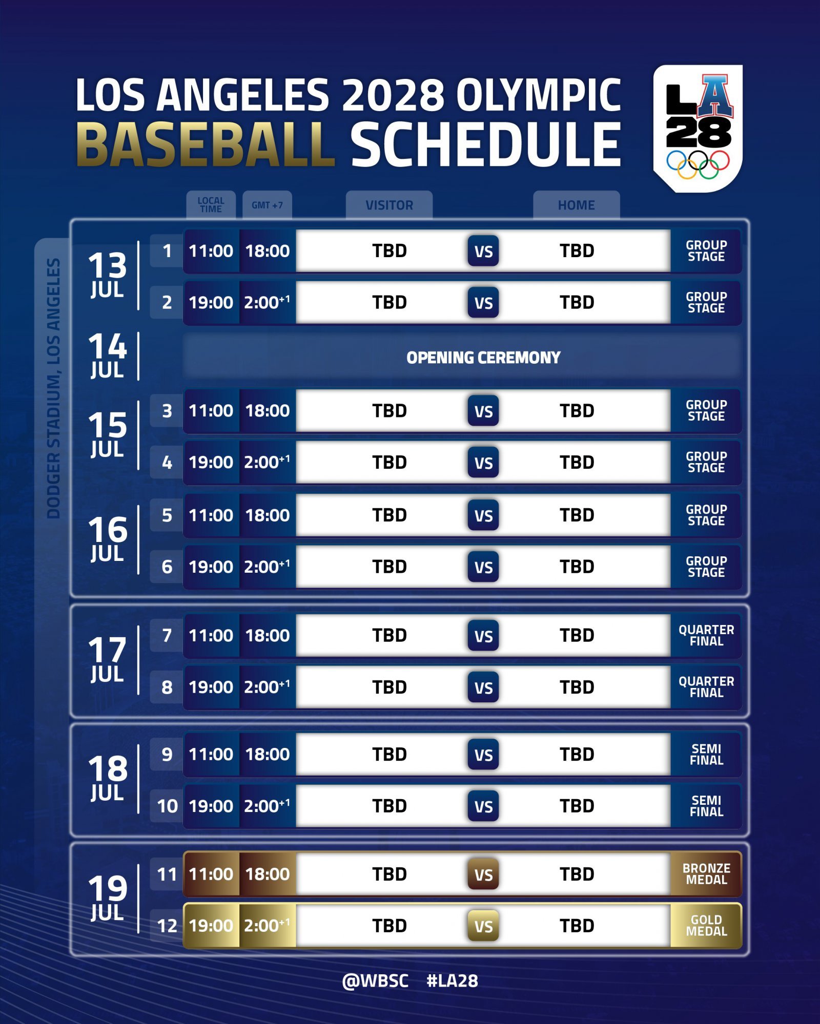 12일(현지 시간) 세계야구소프트볼연맹(WBSC)이 발표한 일정에 따르면 2028년 LA 올림픽 야구 경기는 현지 시간으로 7월13일부터 19일까지 열린다.