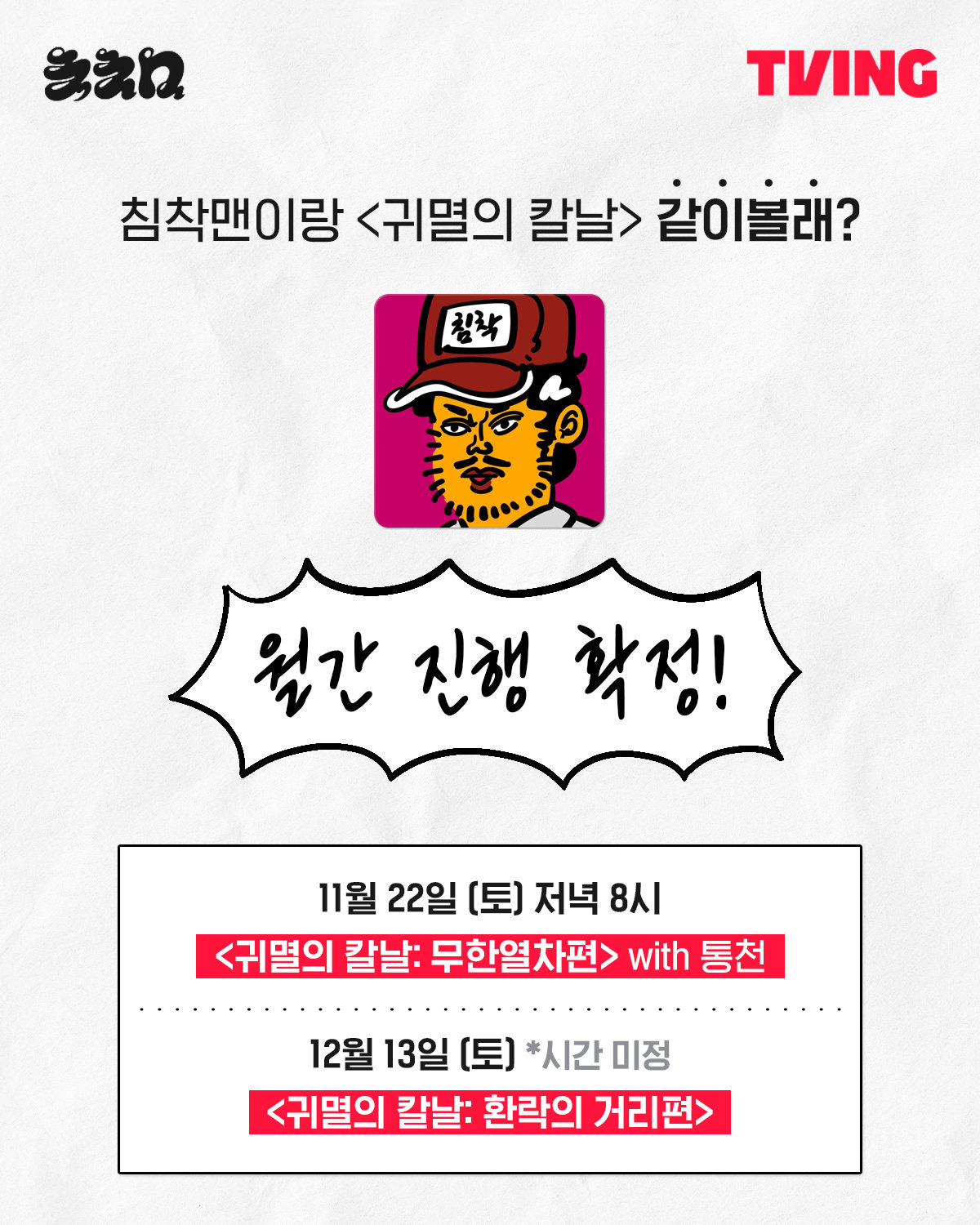 티빙은 오는 22일 ‘귀멸의 칼날: 무한열차편’(10화)을 시작으로, 내달 13일 2기 ‘환락의 거리편’(11화)까지 월간 라이브를 이어간다. 특히 22일 방송에는 침착맨과 그의 동생이자 크리에이터인 ‘통닭천사(통천)’가 함께 출연해 콤비 리액션을 선보인다.