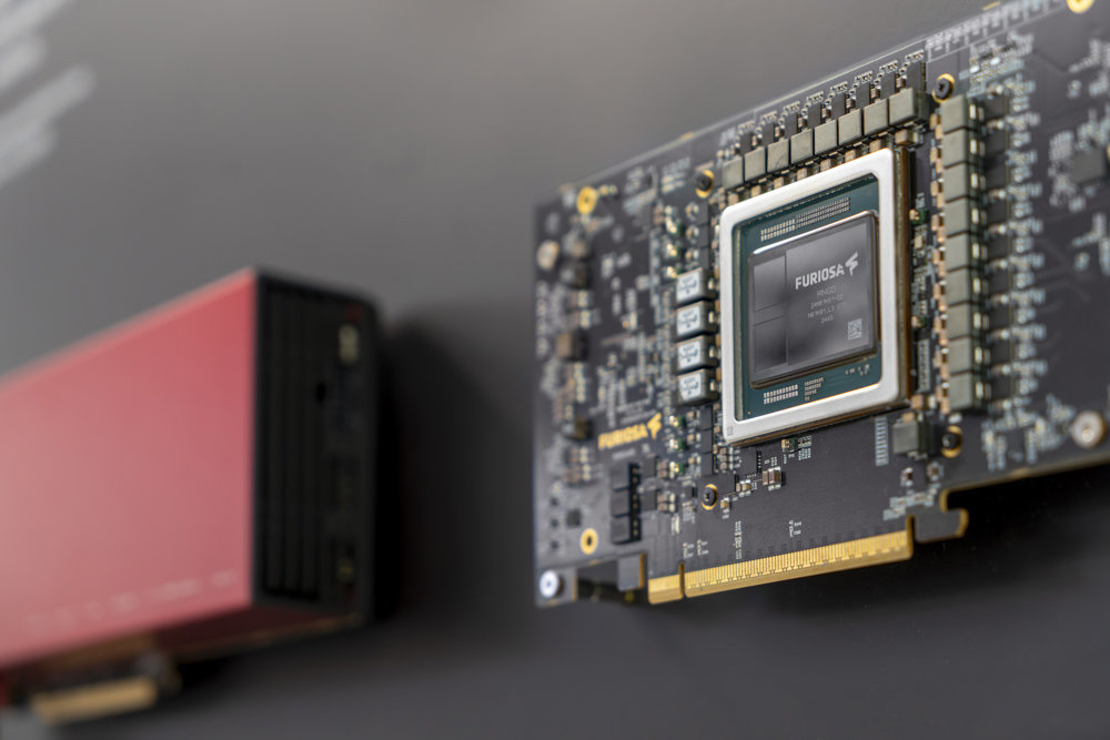 참관객들이 도슨트를 따라 AI 반도체 관련 정보를 보고 있다 / 출처=IT동아 그리고 전시관의 중심에는 우리나라 AI 반도체의 저력을 확인할 수 있는 퓨리오사AI, 리벨리온의 부스가 각각 마련됐다. 퓨리오사AI는 두 대의 RNGD 가속기를 활용해 오픈AI의 오픈웨이트 대형언어모델(LLM) gpt-oss 120B를 오프라인으로 구동하는 데모 시스템, 그리고 8장의 RNGD 가속기를 통해 8비트 부동소수점(FP8) 기준 최대 4페타플롭스(PFLOPS)의 성능을 내는 RNGD 서버를 함께 소개했다. 리벨리온은 주력 제품인 리벨 쿼드 및 아톰 맥스 카드, 아톰 칩이 장착된 NPU AI 서버랙 등을 복합적으로 전시했다.