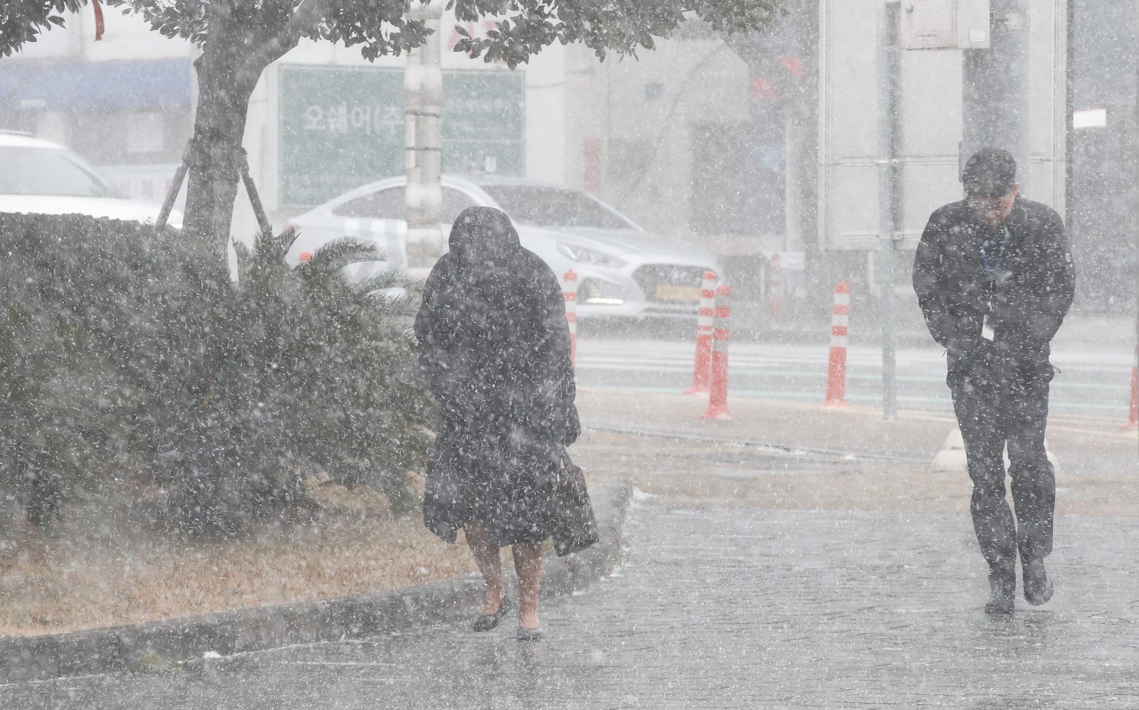 제주지역에 강풍·대설특보가 발효된 7일 오후 제주국제공항 인근 거리에서 시민들이 강한 눈보라를 피해 힘겹게 걸어가고 있다. 2025.02.07 제주=뉴시스