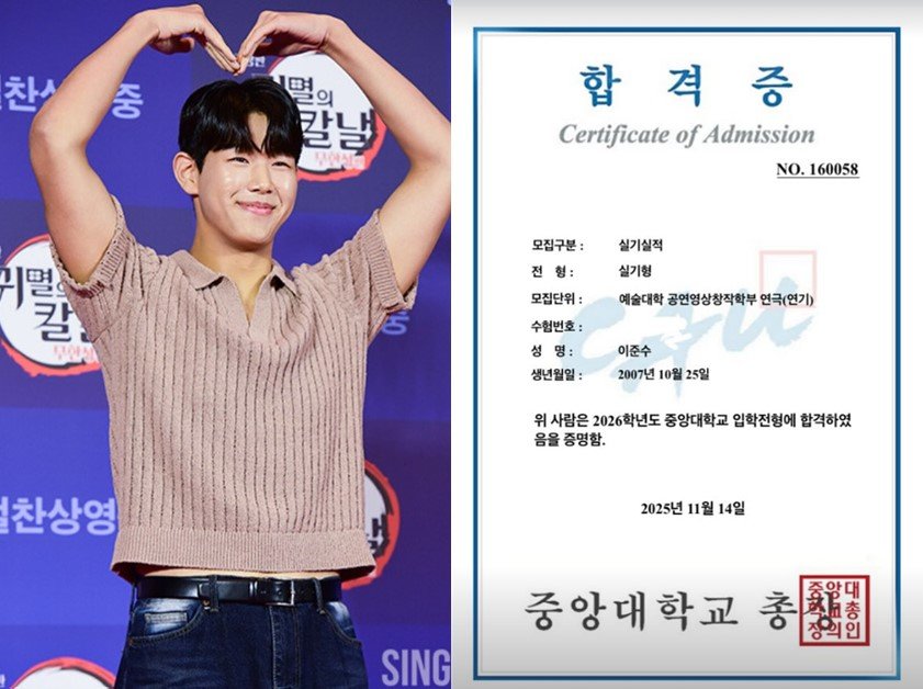 합격증에 따르면 2007년생 이준수는 실기 전형을 통해 예술대학 공연영상창작학부 연극(연기) 전공에 합격했다. 이로써 이준수는 본격적으로 배우의 길에 한 걸음 더 다가서게 됐다.