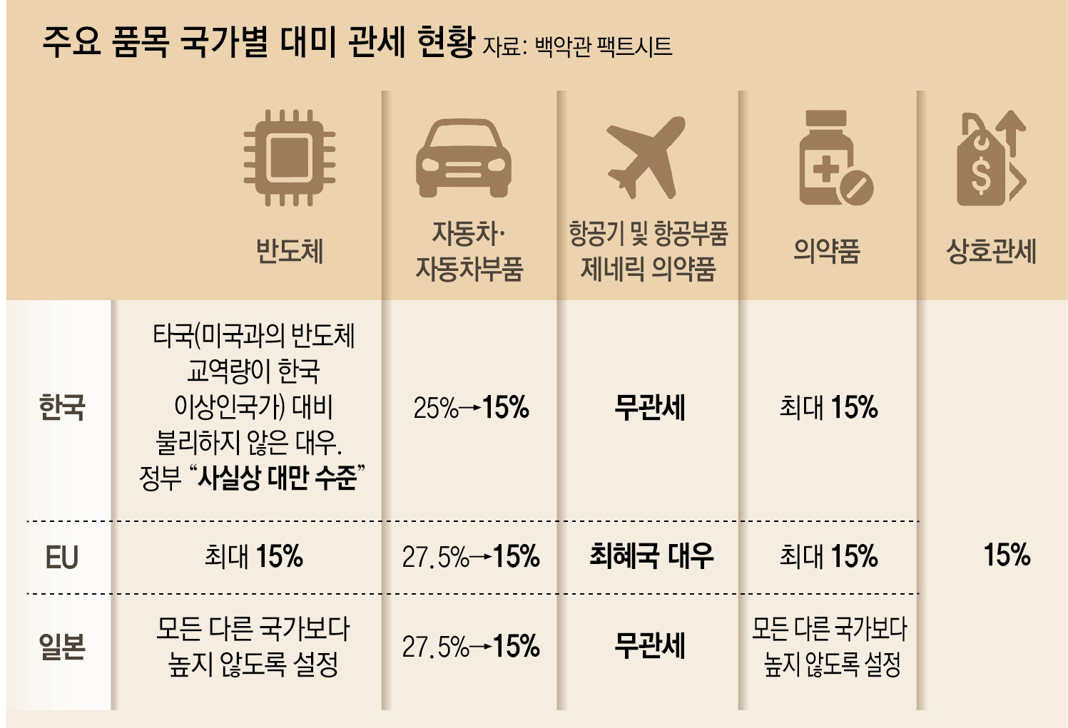 한미 관세·안보 협상 결과를 담은 ‘조인트 팩트시트(joint factsheet·공동 설명자료)’가 14일 최종 확정되면서 자동차와 의약품 등 미국이 한국산 제품에 부과하는 품목 관세율이 15%를 넘지 않게 됐다. 한국의 주력 수출품인 반도체의 경우 미국에 한국 이상의 반도체를 수출(교역)하는 나라보다 불리하지 않은 관세를 적용받기로 했다. 이는 ‘대만보다 불리하지 않은 관세’란 의미라는 게 대통령실의 설명이다.