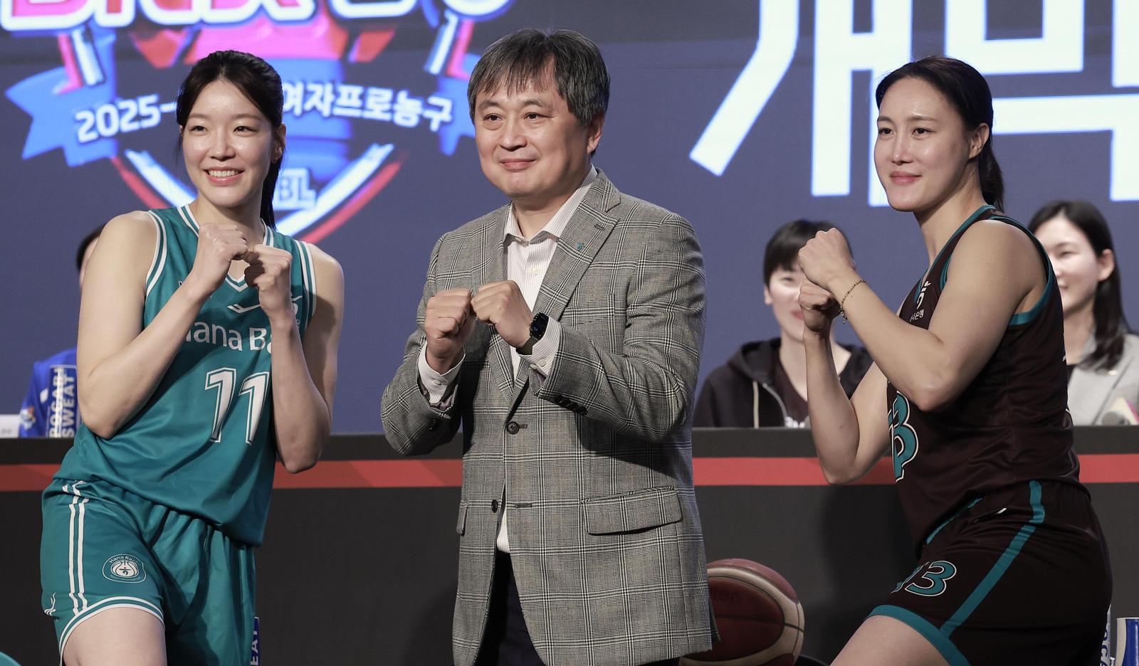 이상범 하나은행 감독(가운데)이 10일 서울 메이필드호텔에서 열린 2025∼2026 여자프로농구(WKBL) 미디어데이 행사 포토타임 때 양인영(왼쪽), 김정은과 포즈를 취했다. 남자프로농구(KBL)에서 20년 넘게 지도자 생활을 했던 이 감독은 KBL 우승 감독 출신으로는 처음으로 WKBL 사령탑 데뷔를 앞두고 있다. 뉴시스