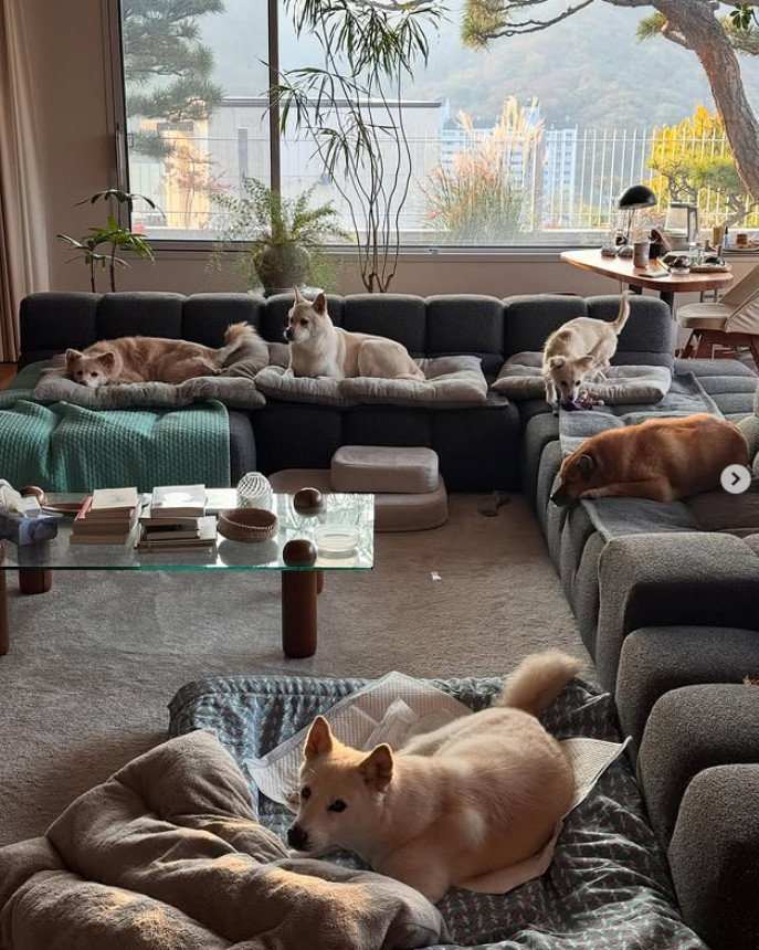 사진에는 이상순 이효리 부부의 집 거실 풍경이 담겼다. 다섯 마리의 반려견들 모두 소파에 각각 자리를 차지하고 앉아 평온하면서도 나른한 시간을 보내고 있는 모습이다.