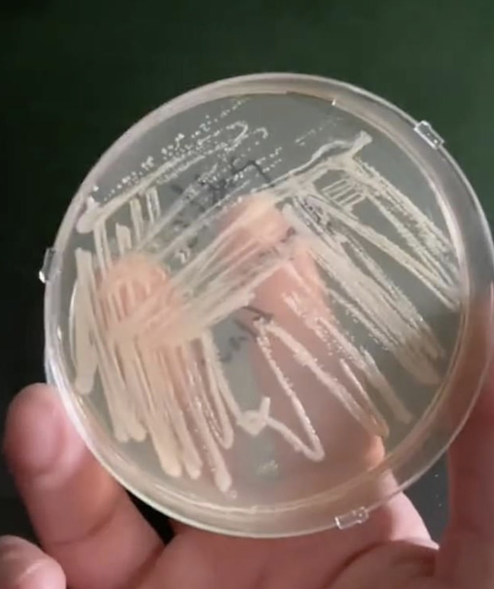 아이커는 면봉으로 바닥을 문질러 표본을 채취한 뒤, 이를 페트리 접시에 옮겨 특수 인큐베이터에 보관했다. 일정 기간 후 접시를 확인하자 두껍게 자란 박테리아를 관찰할 수 있었다.
