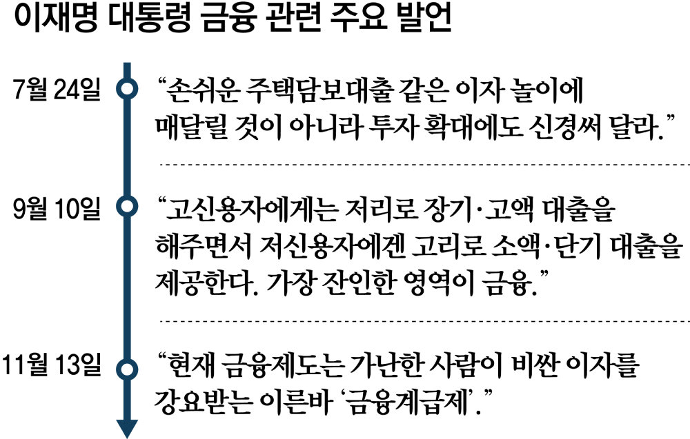 금융권에 대한 정부의 포용금융 압박도 커지고 있다. 이 대통령은 13일 수석보좌관회의에서 “현재 금융제도는 가난한 사람이 비싼 이자를 강요받는 이른바 ‘금융계급제’”라고 지적했다. 앞서 9월 “고신용자의 대출 금리를 높여 저신용자의 대출 금리를 낮춰야 한다”고 언급한 지 두 달 만에 금융 개혁 필요성을 또다시 언급한 것이다.
