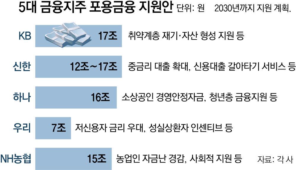 하지만 시장을 왜곡할 정도의 과도한 포용금융이 오히려 독이 될 수 있다는 우려도 나온다. 금융지주 고위 관계자는 “은행들의 인위적인 대출 금리 조정은 결국 전체 금융 소비자들에게 전가될 수밖에 없다”며 “성실하게 대출을 갚는 사람들이 빚을 갚지 않거나 못 갚은 사람들에 비해 역차별을 받는 상황은 시장 원리에 반하는 것”이라고 했다.