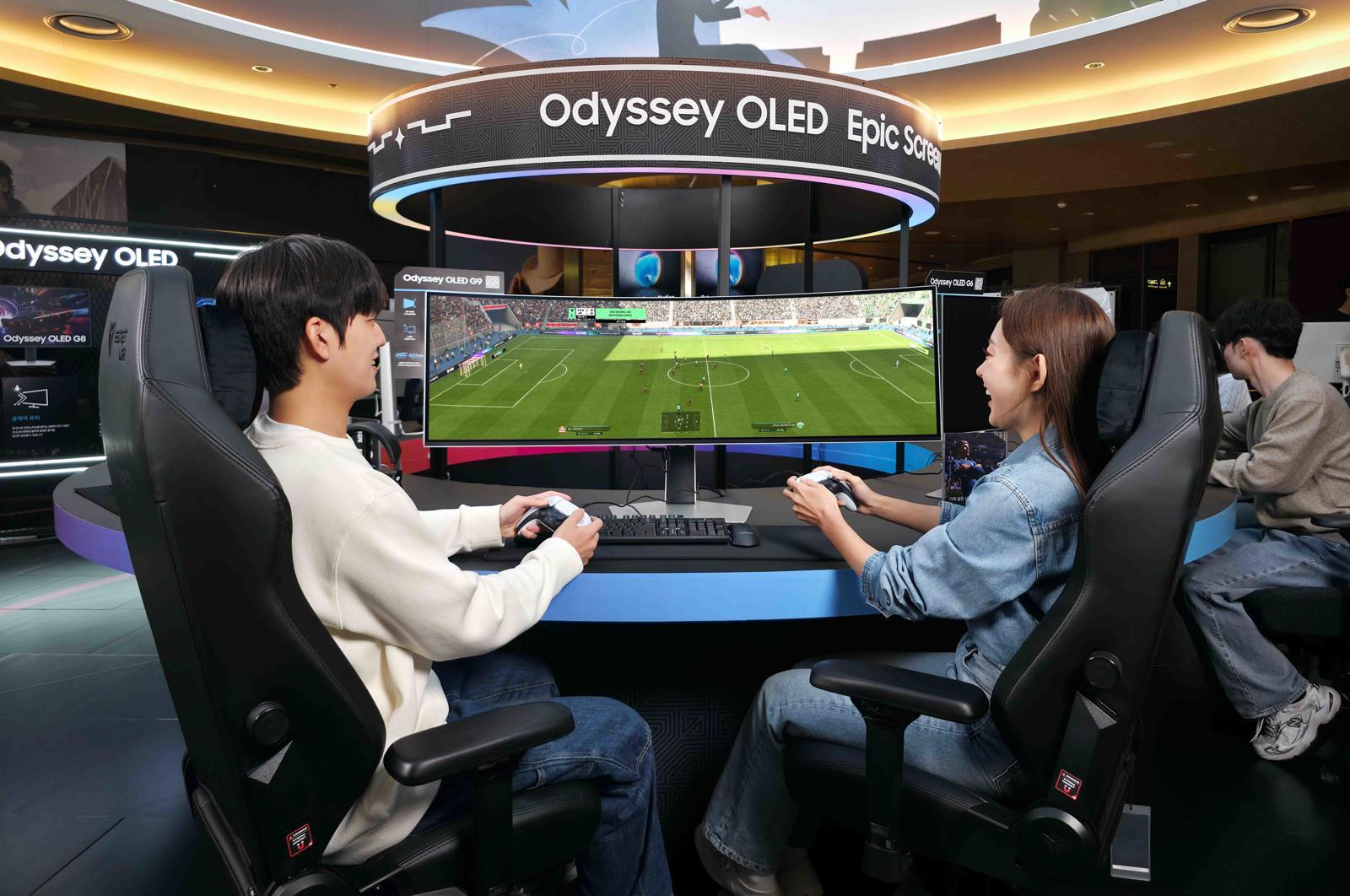 삼성전자가 15∼23일 서울 강남구 파르나스몰에서 ‘오디세이 게임 스테이션’ 팝업 체험존을 운영한다. 이곳은 삼성전자 오디세이 게이밍 모니터와 갤럭시 스마트폰을 사용해 최신 게임을 해 볼 수 있는 곳이다. 사진은 모델들이 최신 축구게임을 즐기는 모습.