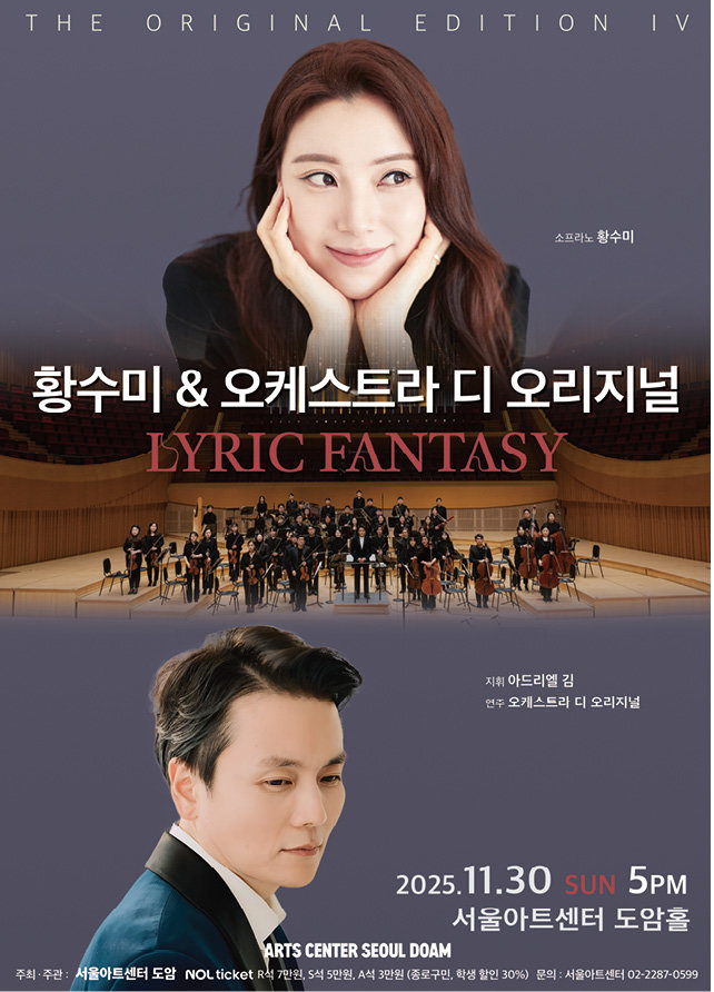 소프라노 황수미가 노래하고 오케스트라 디 오리지널이 연주하며 아드리엘 김이 지휘를 맡는 ‘LYRIC FANTASY’ 공연이 오는 30일(일) 오후 5시 서울아트센터 도암홀(서울 종로구)에서 열린다.