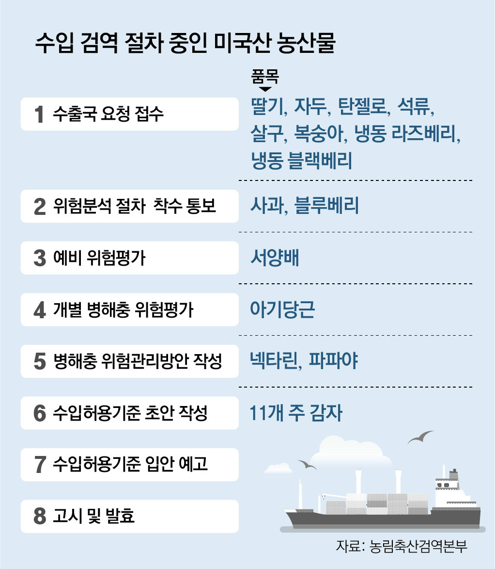 현재 미국산 농산물 15개 품목이 한국으로 수출되기 위한 검역 절차를 밟고 있다. 외국산 농산물이 한국에 들어오기 위해서는 단계별로 △수출국 요청 접수 △위험분석 절차 착수 통보 △예비 위험평가 △개별 병해충 위험평가 △위험관리방안 작성 △수입허용기준 초안 작성 △수입허용기준 입안 예고 △고시 및 발효 등 8단계의 수입 위험 분석(IRA) 과정을 거쳐야 한다. 특히 병해충 위험을 평가하는 3, 4단계가 핵심이다.