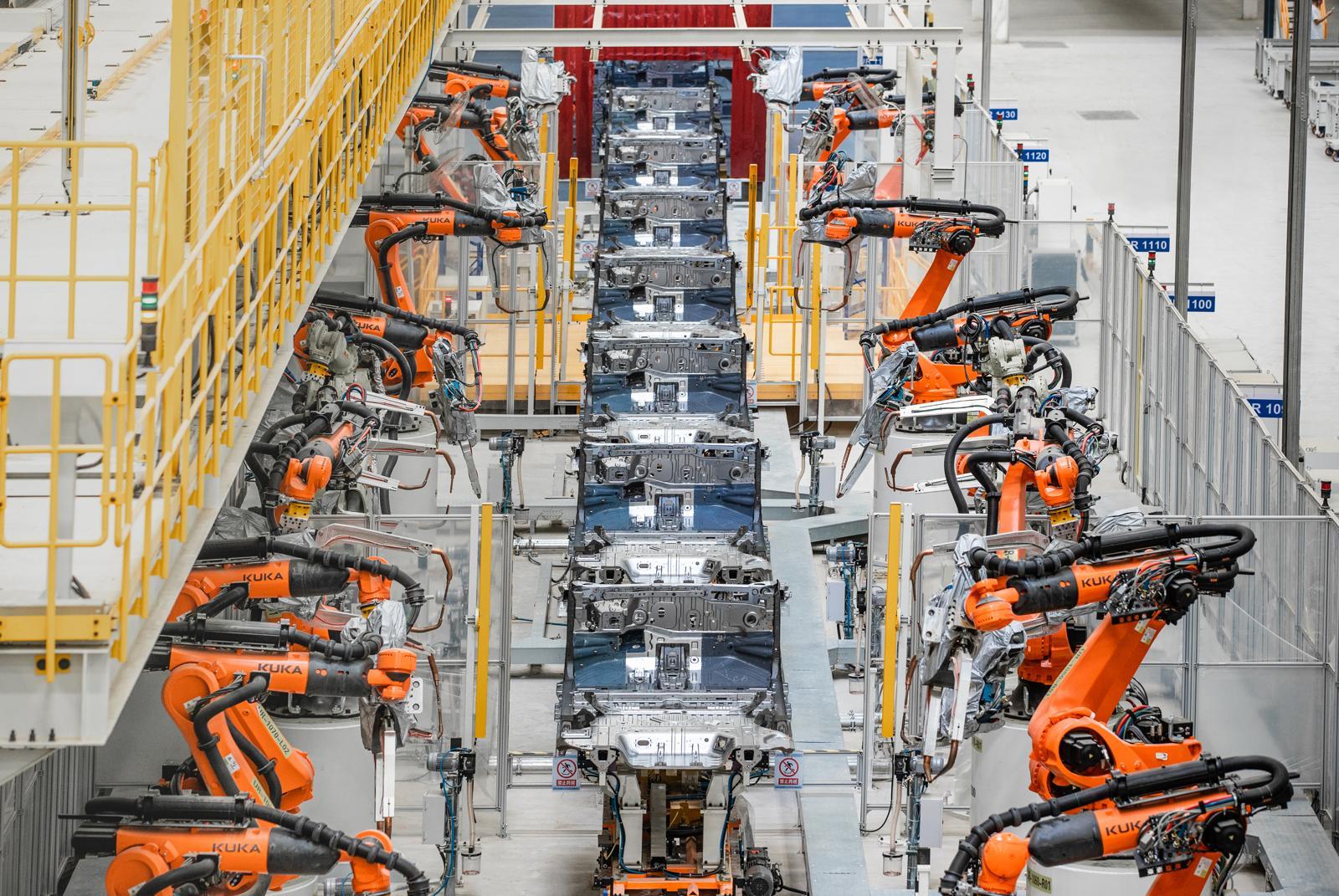 중국 허난성 정저우의 비야디(BYD) 공장에서 팔 형태의 로봇들이 차체를 용접하고 있다. 이곳에서는 용접 작업의 98%를 이 같은 로봇 팔 총 2400여 대가 대신한다. BYD코리아 제공