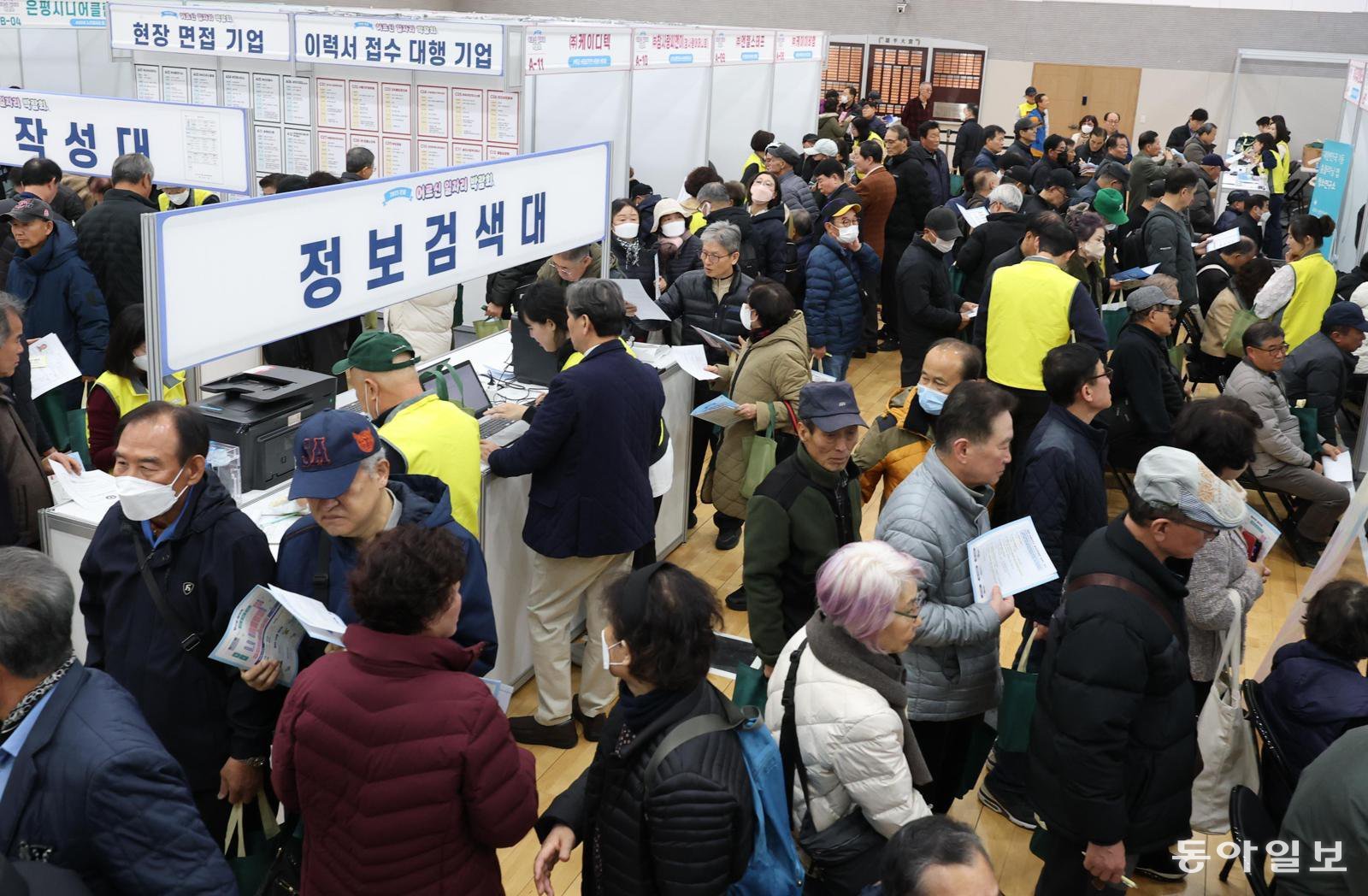 17일 오후 서울 은평구청에서 열린 ‘은평 어르신 일자리박람회’ 행사장이 어르신 구직자들로 붐비고 있다. 이날 박람회는 60세 이상 구직자에게 재취업 기회와 일자리 정보를 제공하고, 인력난을 겪는 구인 기업에는 경력 있는 어르신을 채용할 수 있는 기회를 주기 위해 마련됐다.