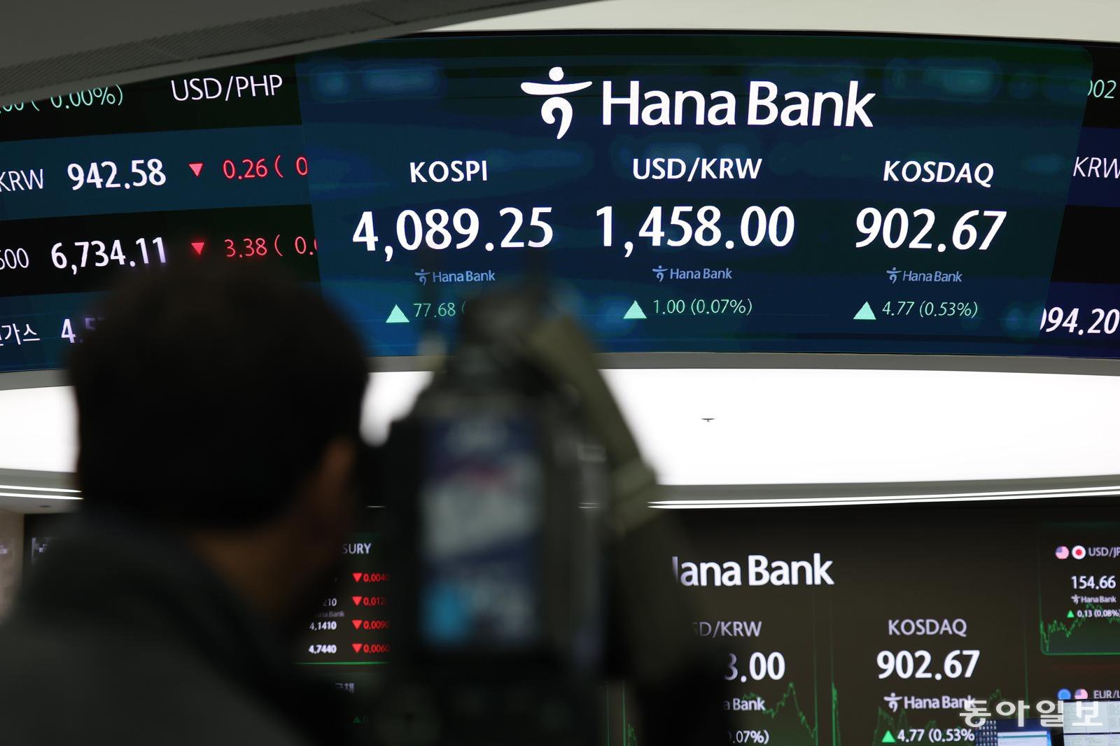 17일 오후 서울 중구 하나은행 딜링룸 전광판에 원-달러 환율 주간 거래 종가가 1458원으로 표시돼 있다. 환율은 이날 야간 거래에서 1460원을 넘기도 했다.