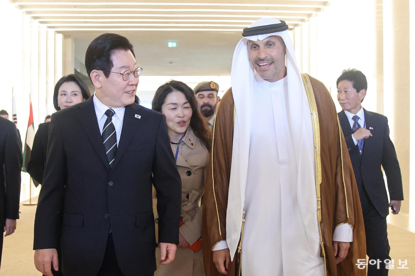 아랍에미리트 등 4개국 순방에 나선 이재명 대통령이 17일(현지 시간) 첫 순방지인 아랍에미리트 아부다비 왕립공항에 도착해 칼둔 칼리파 알 무바라크 퍼스트아부다비뱅크 비상임이사 겸 이사회 운영위원회 의장의 안내를 받으며 이동하고 있다. 아부다비=송은석 기자 silverstone@donga.com